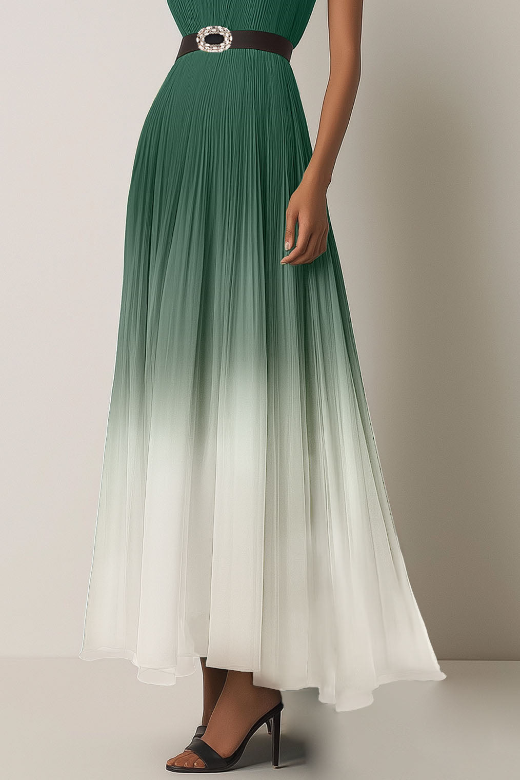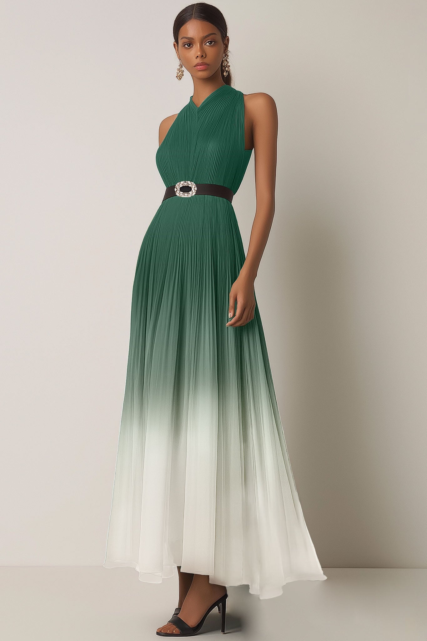 Evening Dress Green-White Ombre Pleated Chiffon Waist Tie Maxi Dress