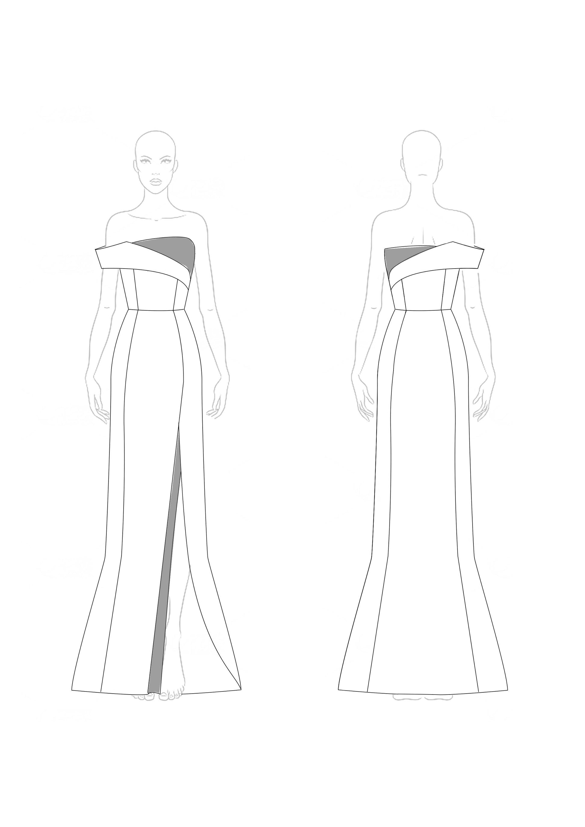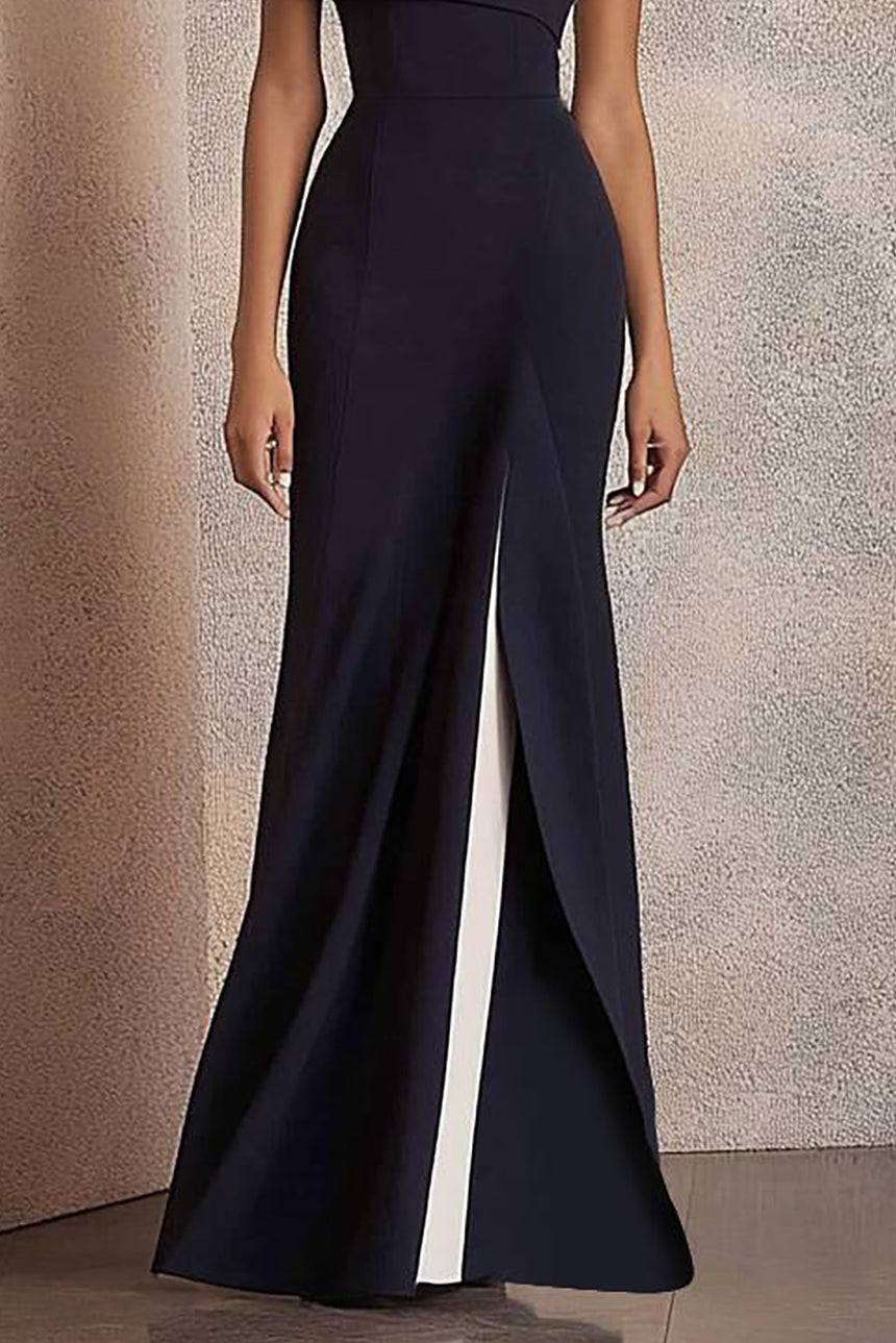 This black and white one-shoulder maxi dress features a bold asymmetrical slit and flowing silhouette. Its colorblock design and elegant cut make it ideal for formal evening events where you want to make a statement.