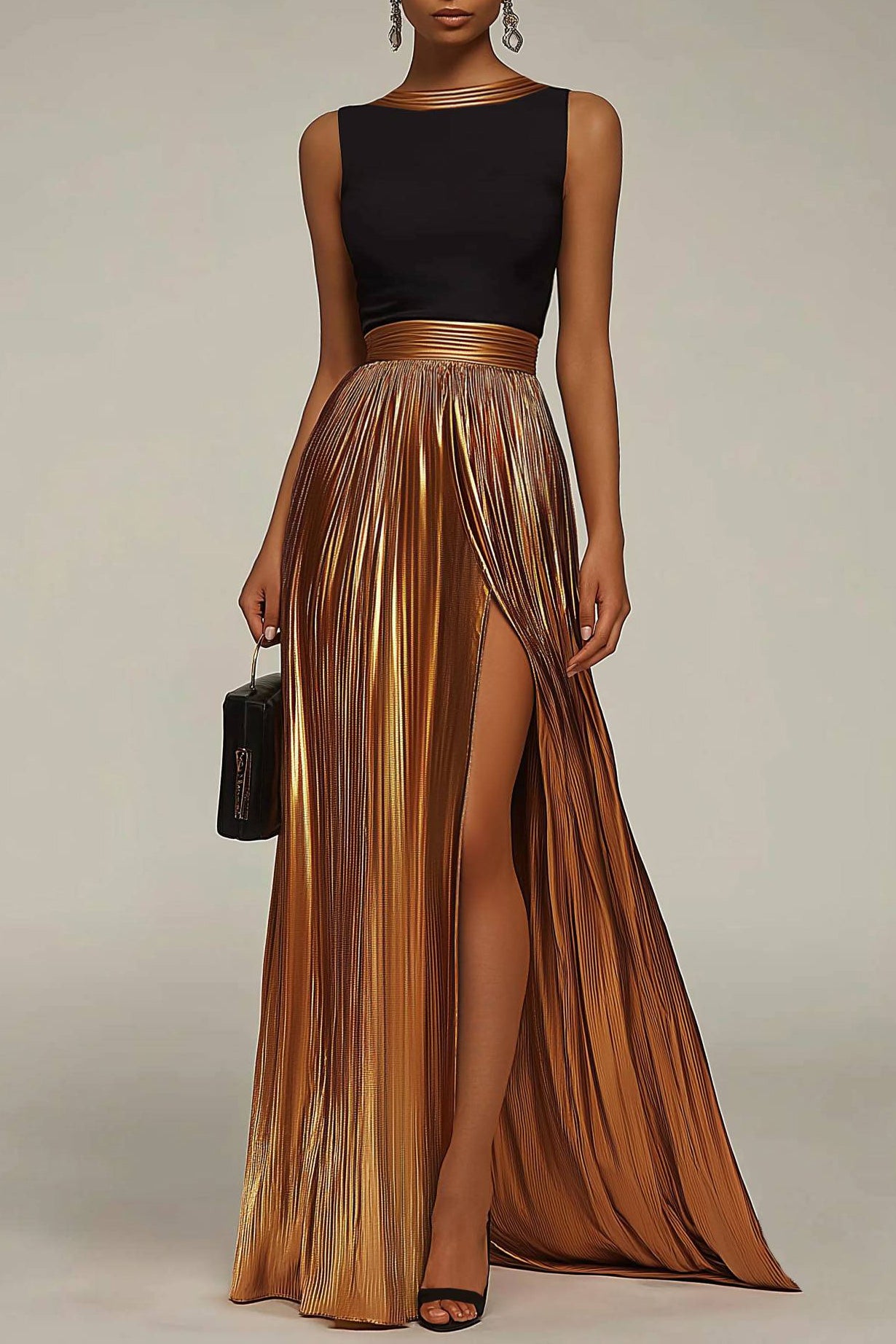 Evening Formal Dress Black-Gold Colorblock Round Neck Pleated Maxi Dress