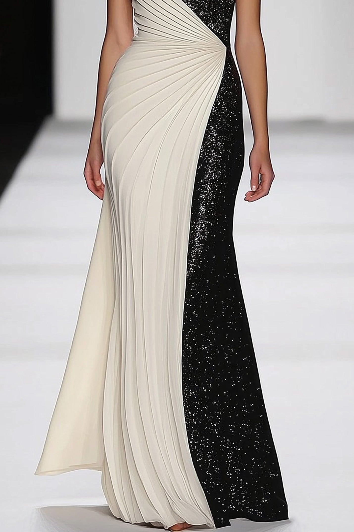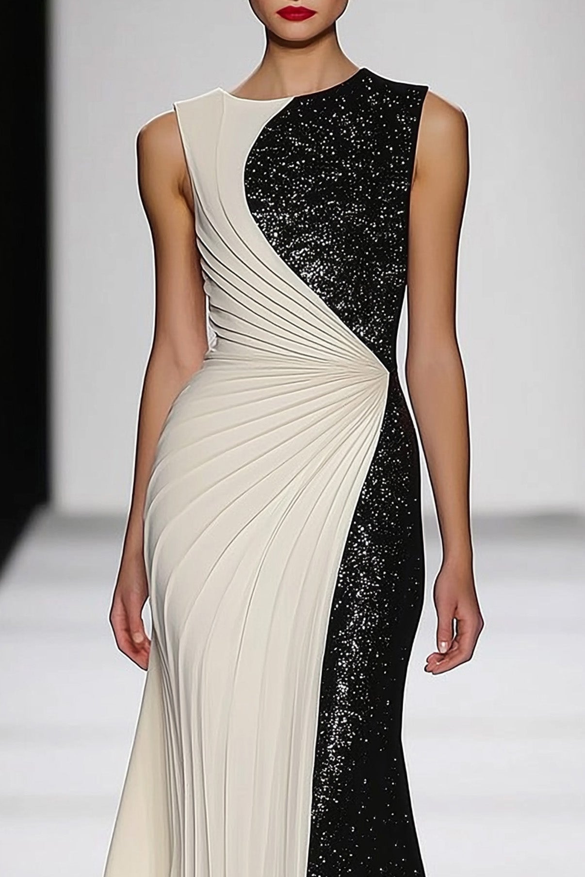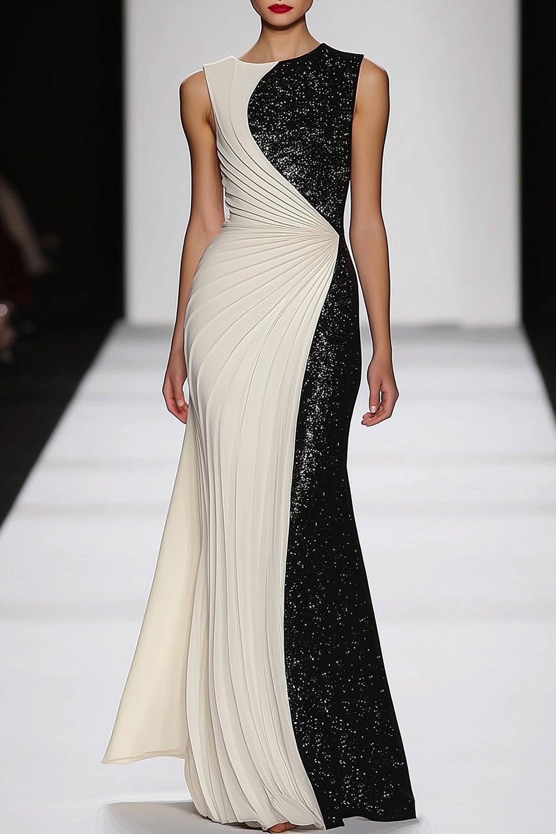 This glamorous black and white evening dress is adorned with sparkling sequins and pleats, creating a shimmering effect. The round neck and sleeveless design offer a classic yet modern look. The floor-length gown is perfect for formal occasions like galas or elegant dinner parties.