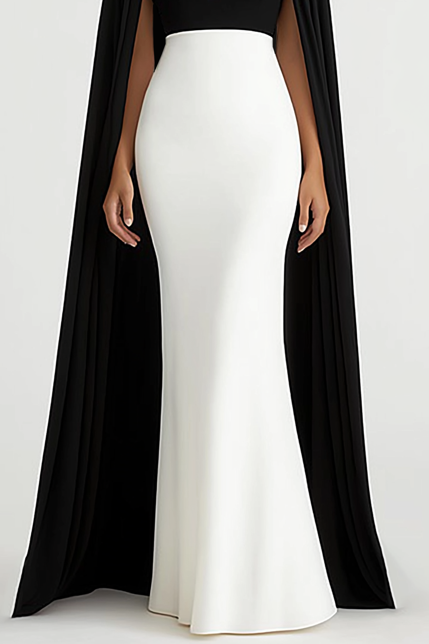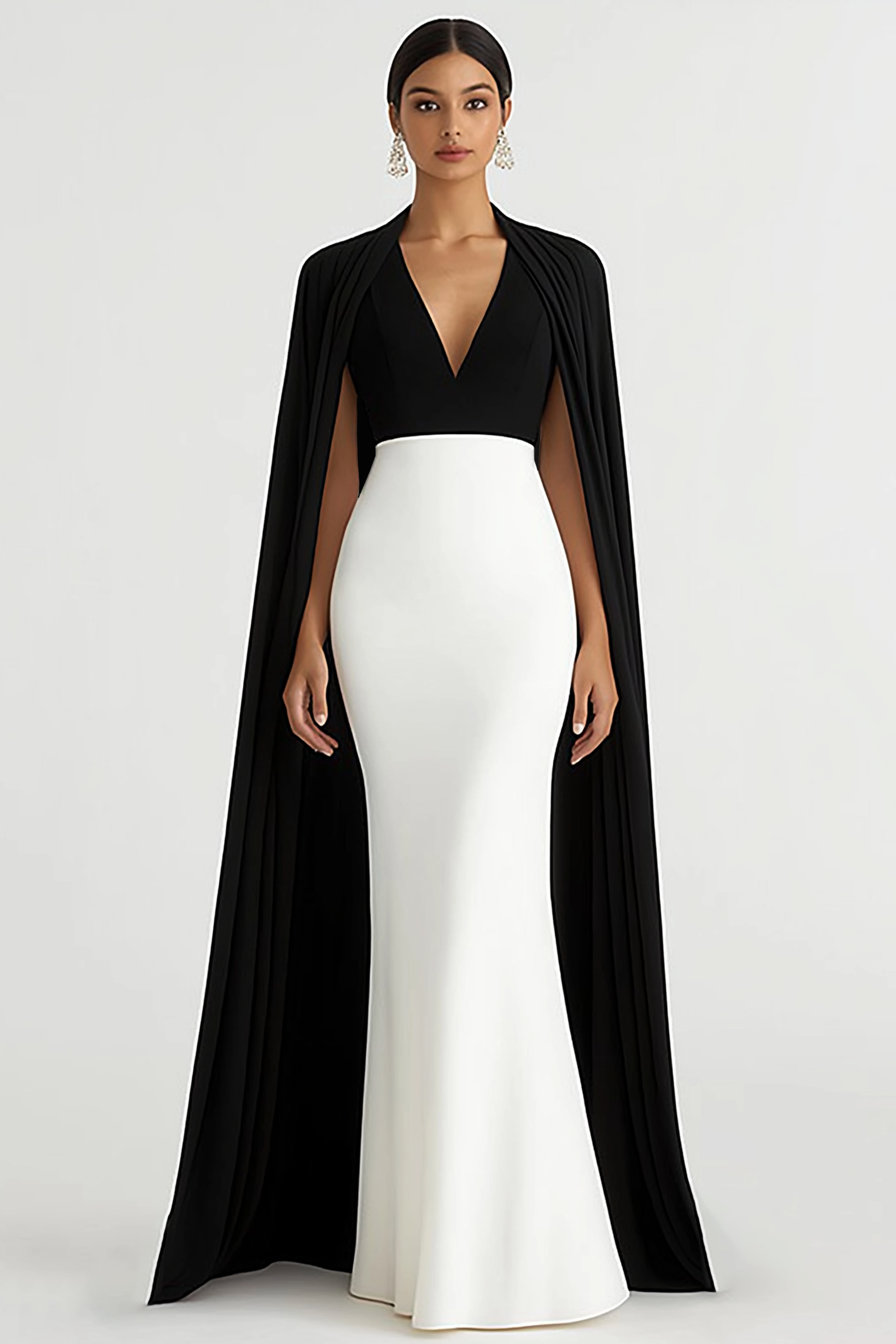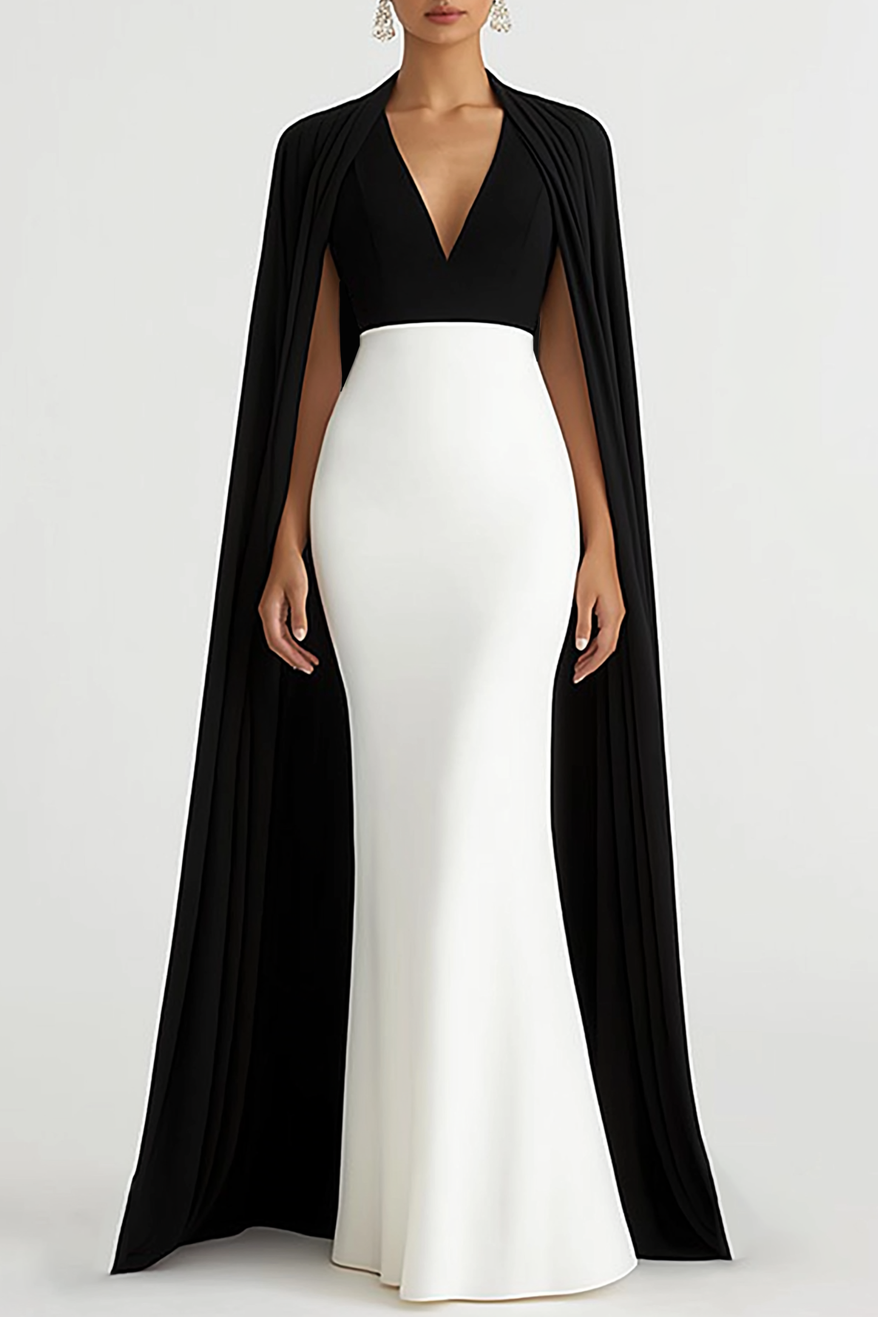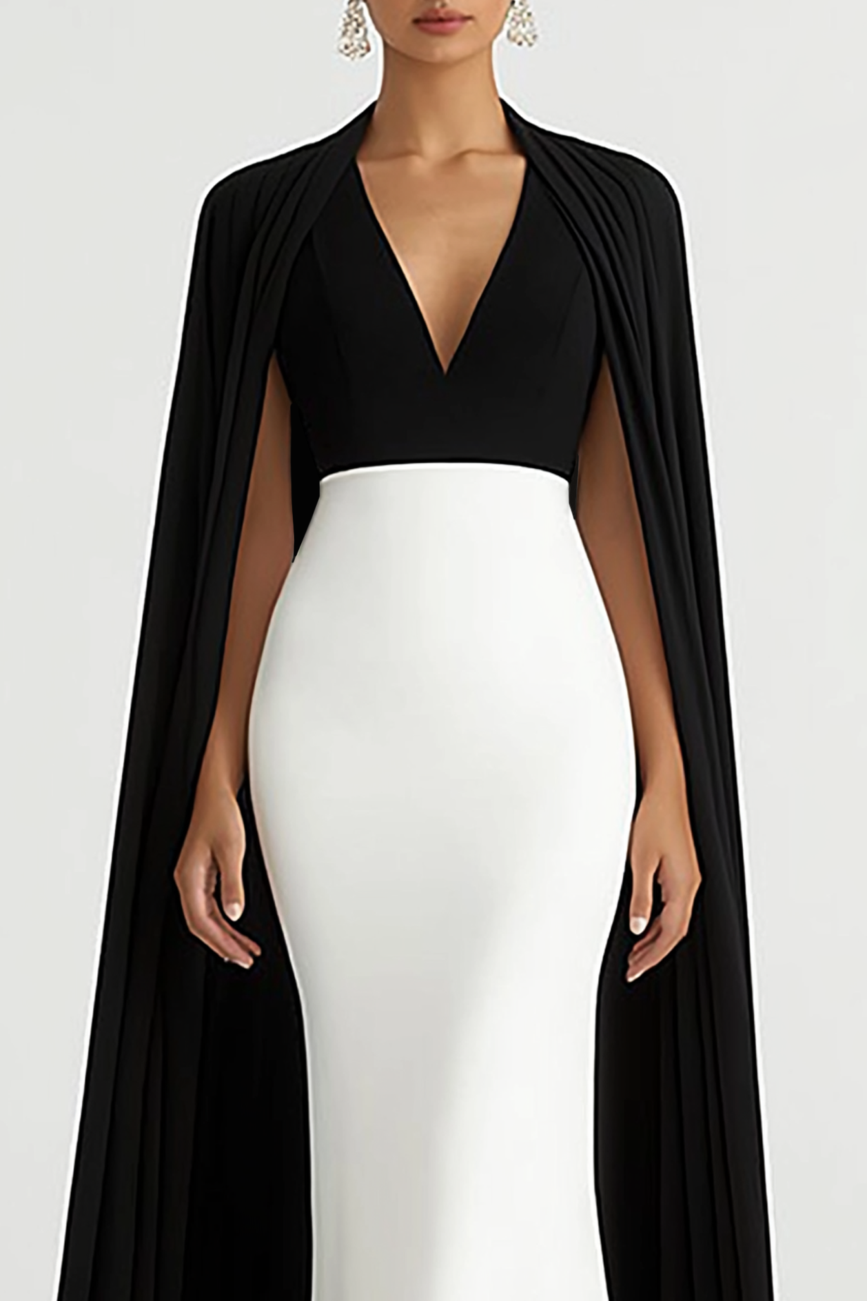 Evening Formal Dress Black White V-Neck Cape Floor-Length Gown