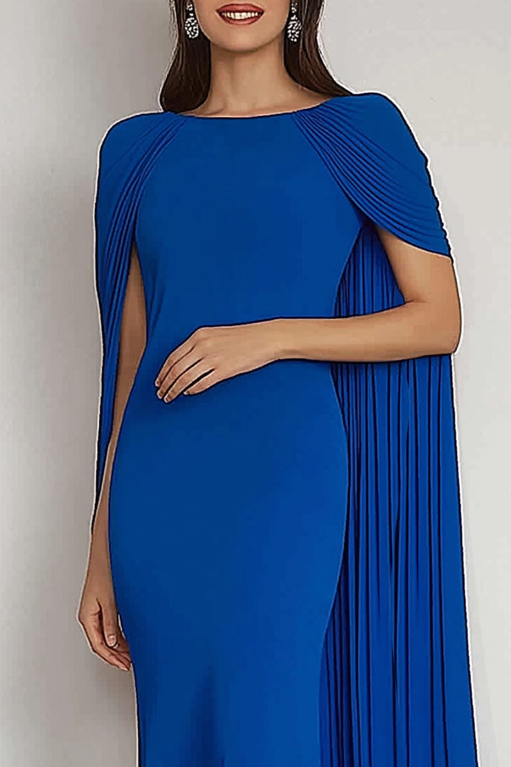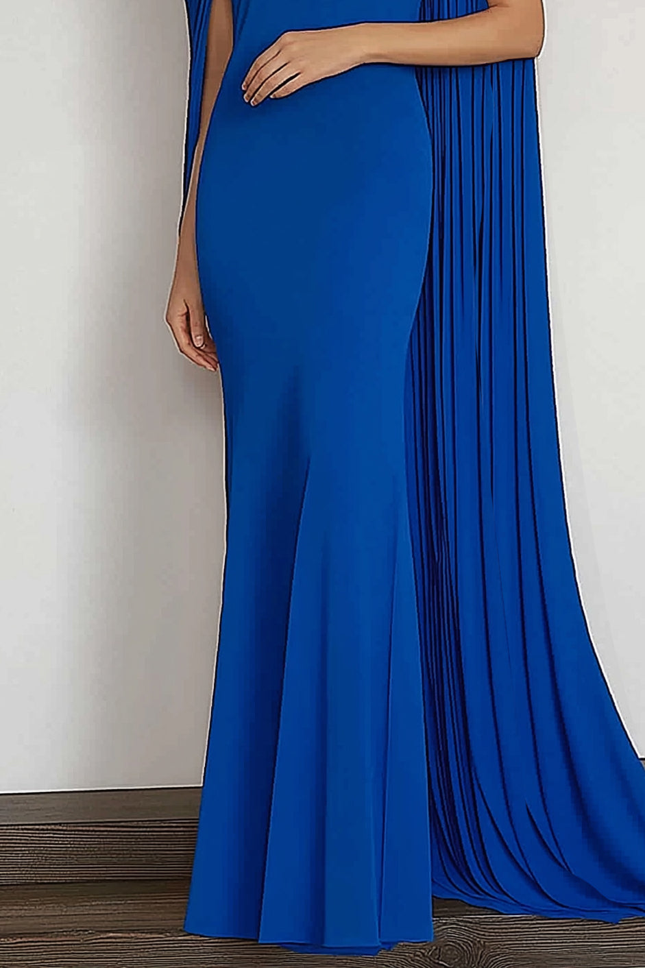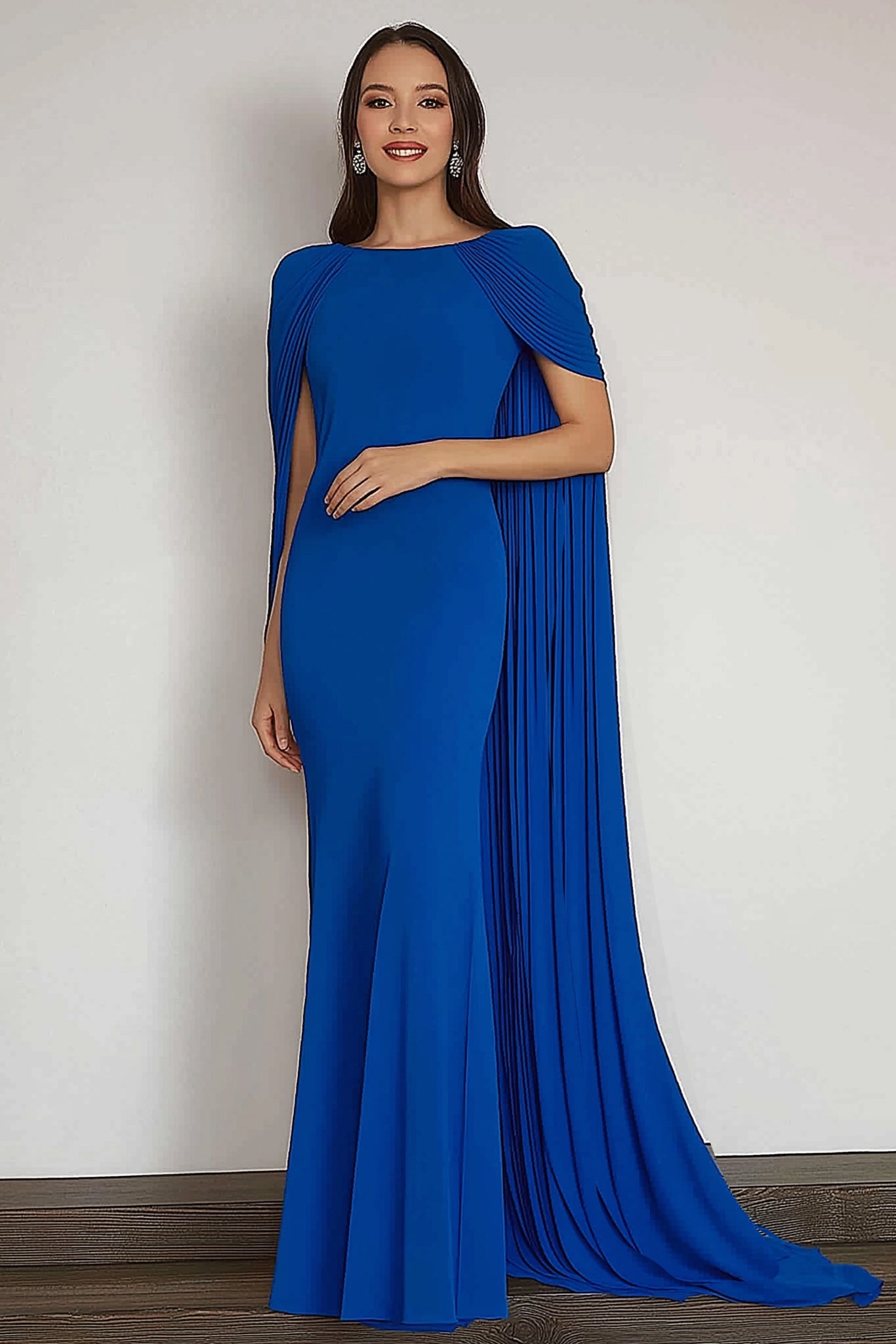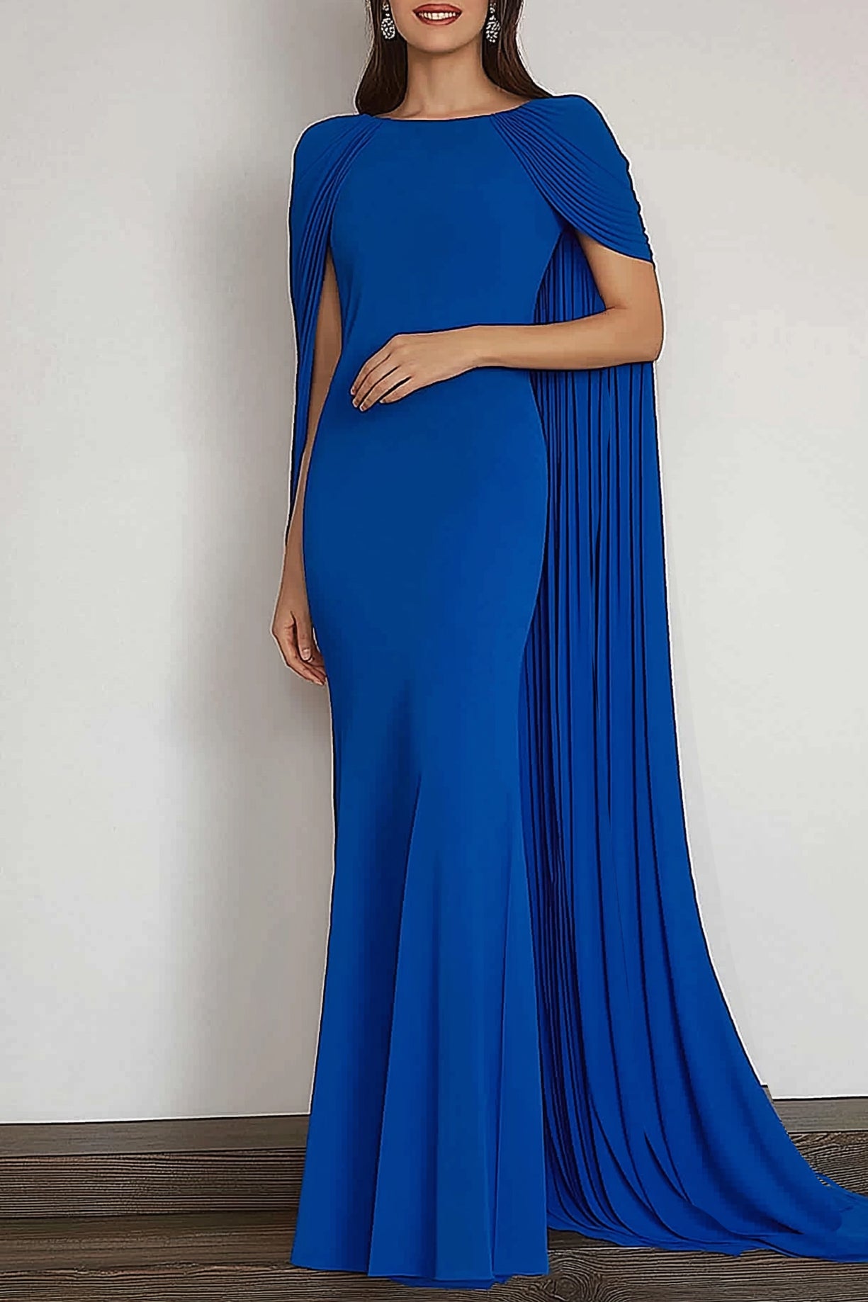Evening Formal Dress Blue Round Neck Cape Mermaid Floor-Length Gown