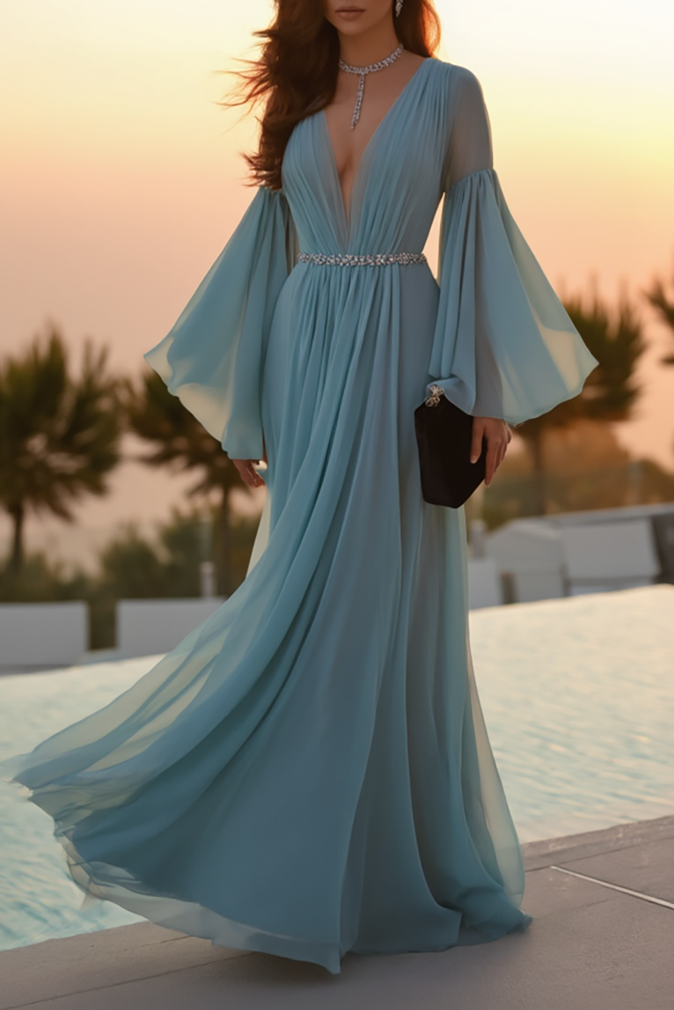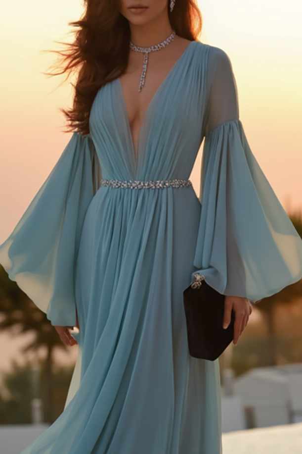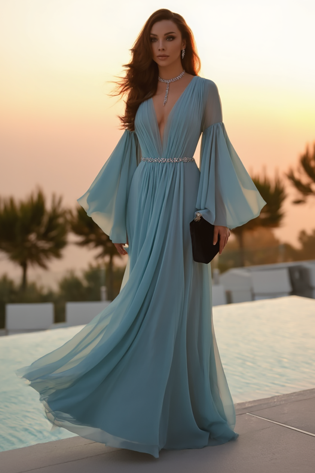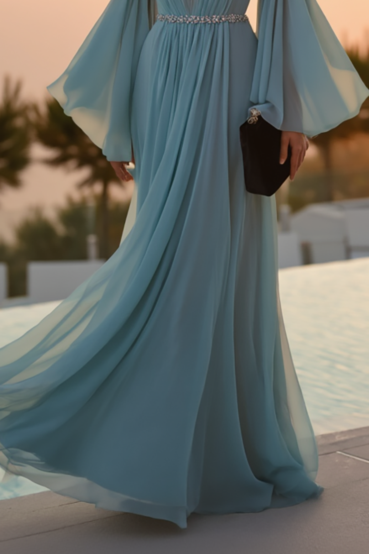 Evening Formal Dress Light Blue Bell Sleeve Chiffon Floor-Length Gown