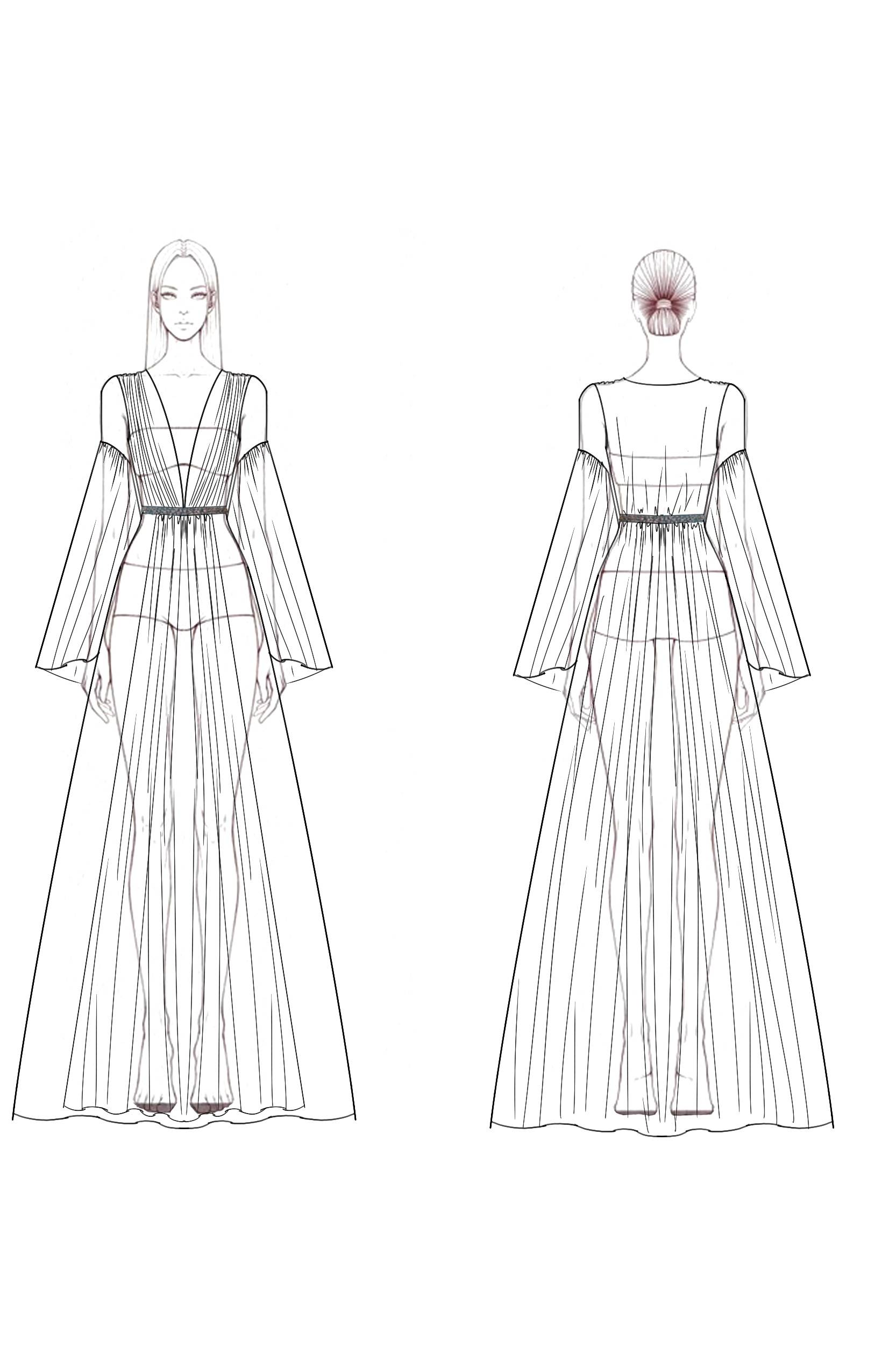 This light blue gown delivers ethereal beauty with its deep V neckline, soft chiffon fabric, and dramatic bell sleeves. The floor-length silhouette adds elegance and flow. A romantic and refined look that’s ideal for evening parties, receptions, or formal weddings.