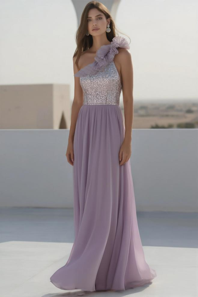 This purple evening formal sequin dress features a one-shoulder design and a stunning floor-length silhouette, offering an elegant and glamorous look perfect for gala events, weddings, or special evening occasions.