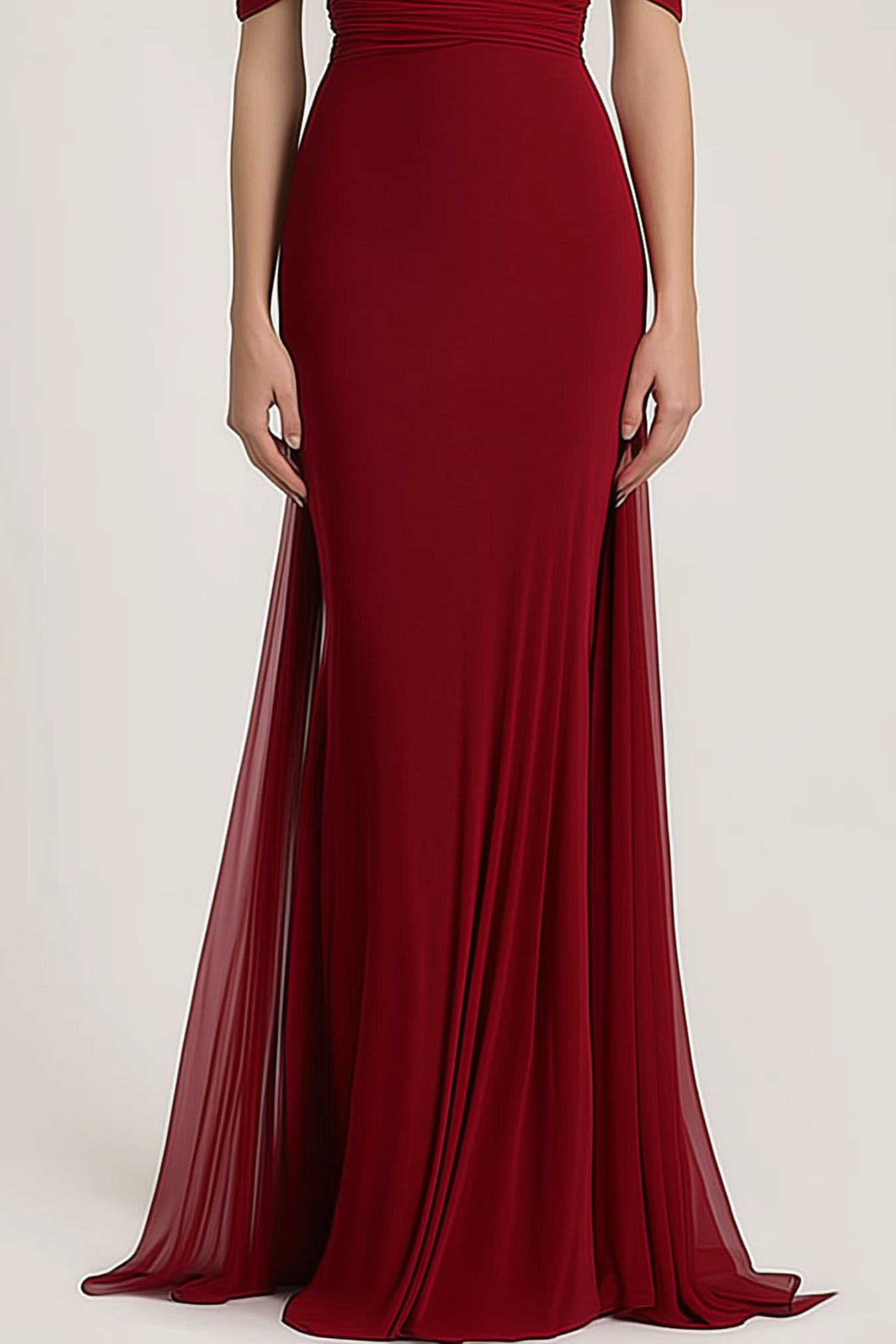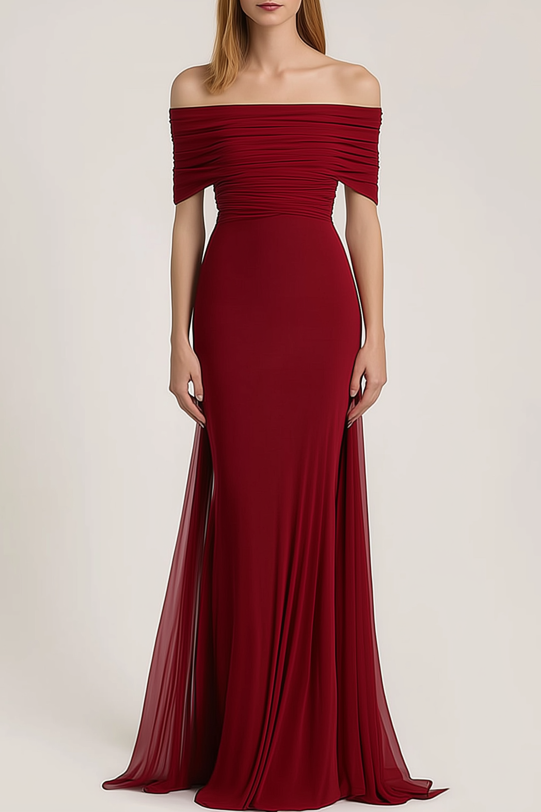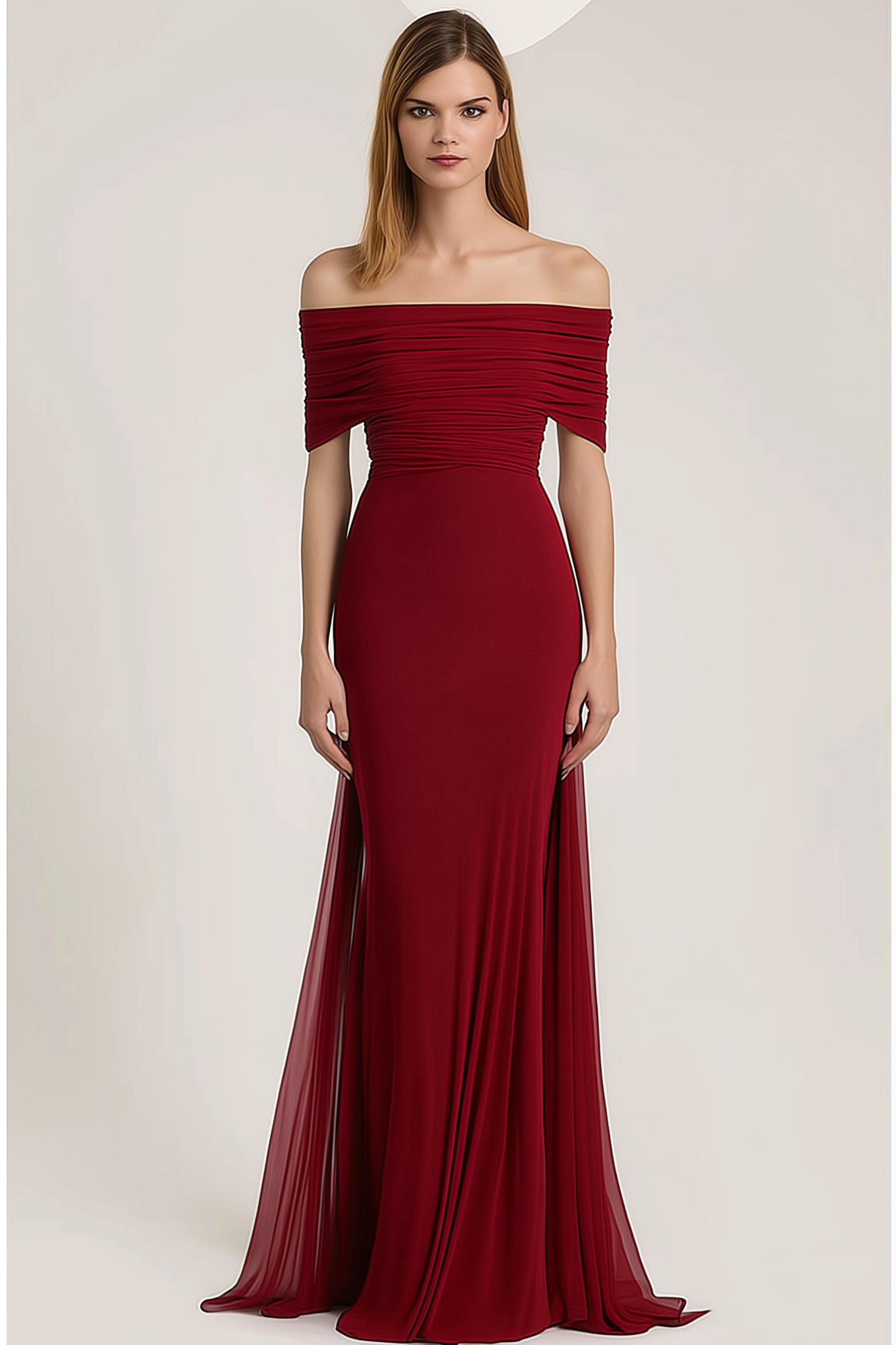 Evening Formal Dress Red Off-Shoulder Chiffon Floor-Length Gown