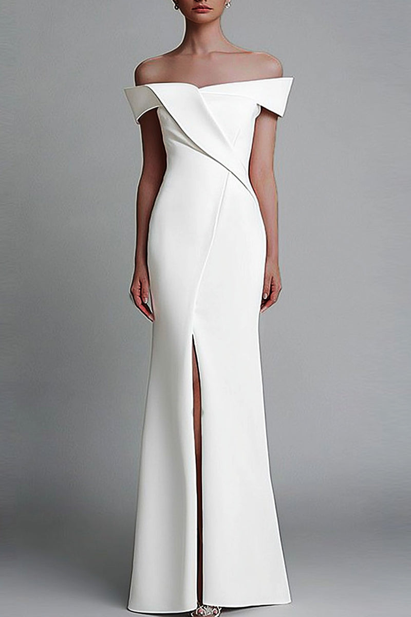 Radiate grace and sophistication in this Evening Formal Elegant Off Shoulder White Maxi Dress. Designed for those special occasions when you want to make a stunning impression, this dress features a timeless off-shoulder neckline that adds an element of allure while keeping it elegant. The floor-length silhouette flows effortlessly, creating a flattering and feminine shape, perfect for galas, weddings, or upscale evening events. The pure white color exudes elegance and purity, while the luxurious fabric drapes beautifully, giving you a refined and polished look. Whether you're attending a formal dinner, a wedding celebration, or a black-tie event, this dress ensures you stand out with style and grace.
