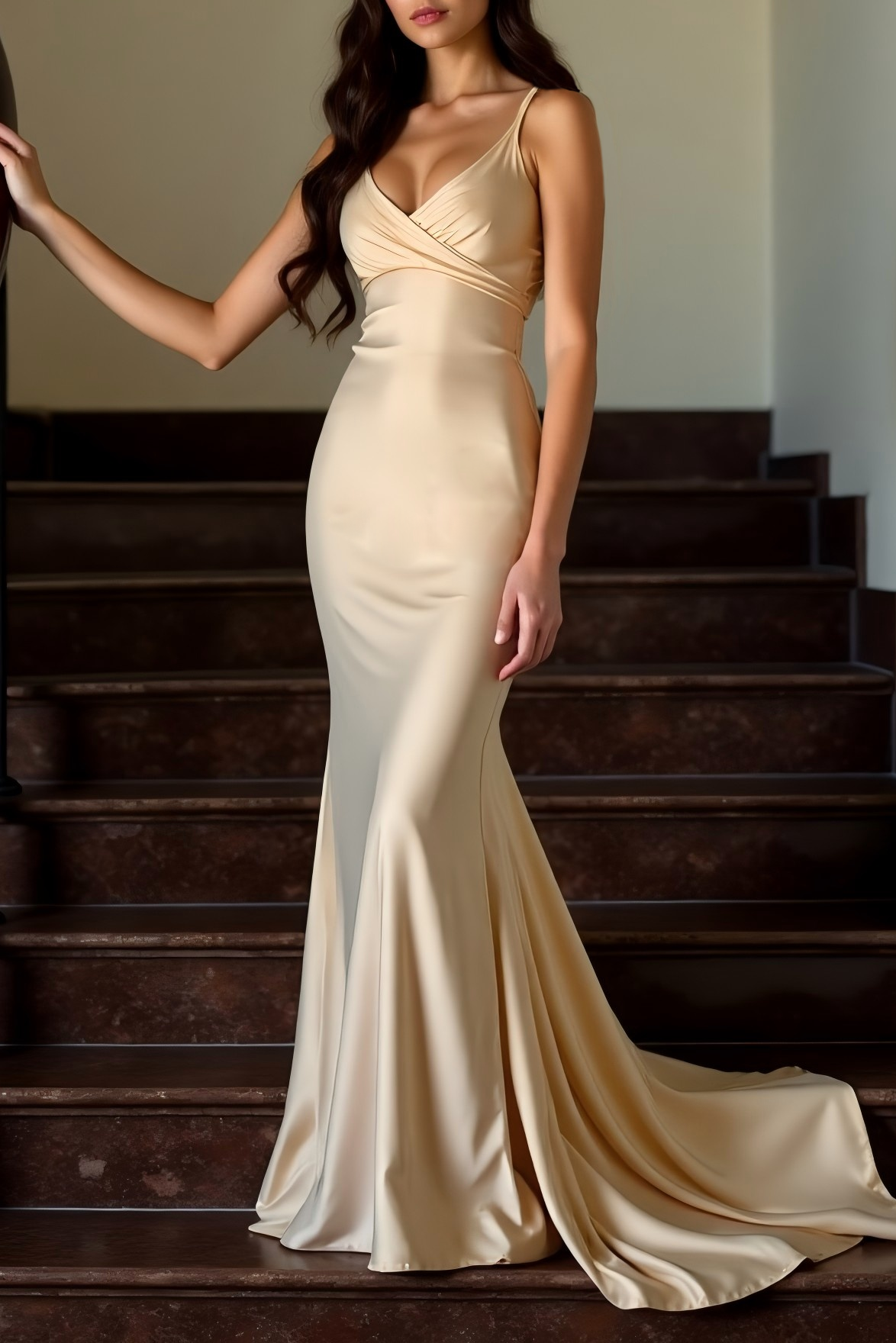 Turn heads in this apricot satin gown featuring a spaghetti strap and cross neck design. The glossy satin fabric flows into a soft train, giving you a luxurious silhouette perfect for formal events, evening receptions, or black-tie occasions.
