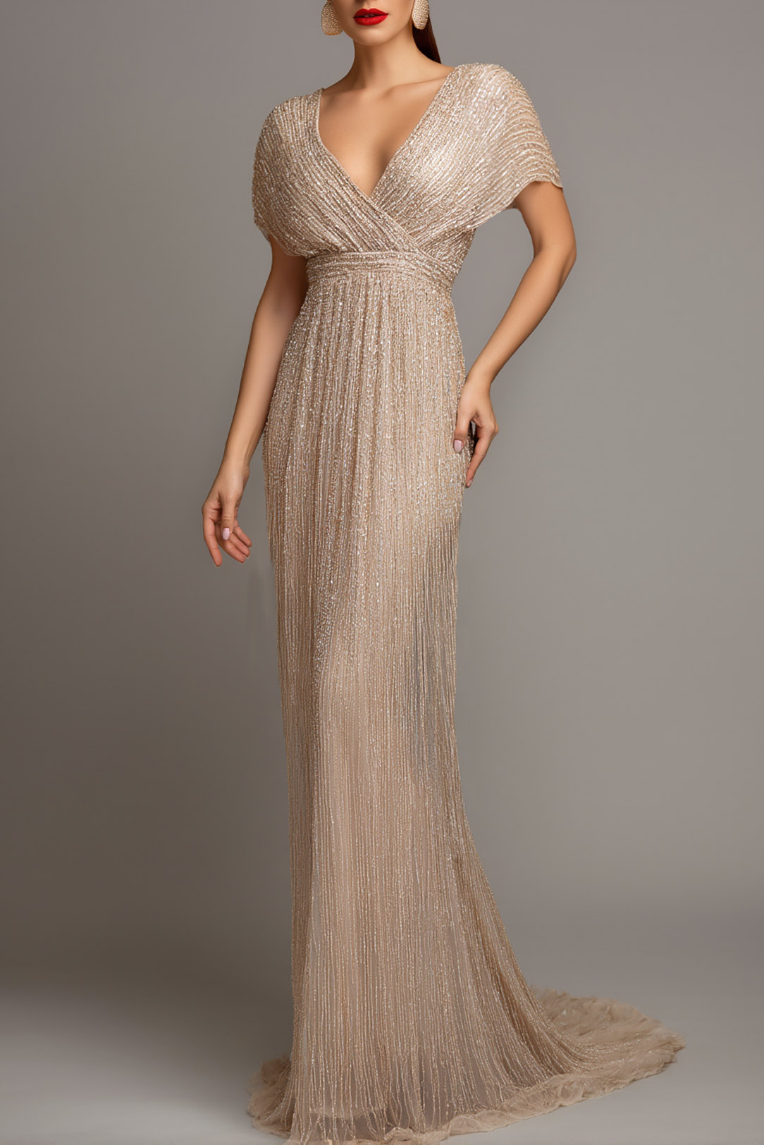 Evening Formal Gown Champagne Sequin Cross Neck Floor-Length Dress