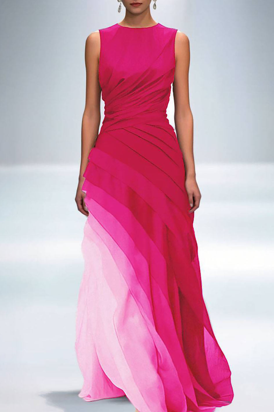 Dazzle in this magenta gradient gown, featuring a round neckline and sleeveless cut. The floor-length design adds elegance, while the rich gradient colors enhance its visual appeal. Perfect for formal occasions, this dress offers a timeless yet modern look for any evening event.