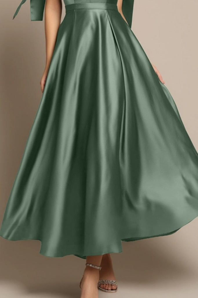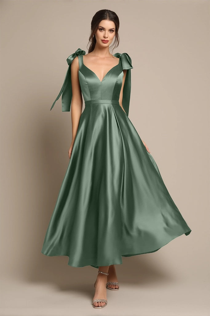 Evening Formal Satin Dress Green V Neck A-Line Maxi Dress