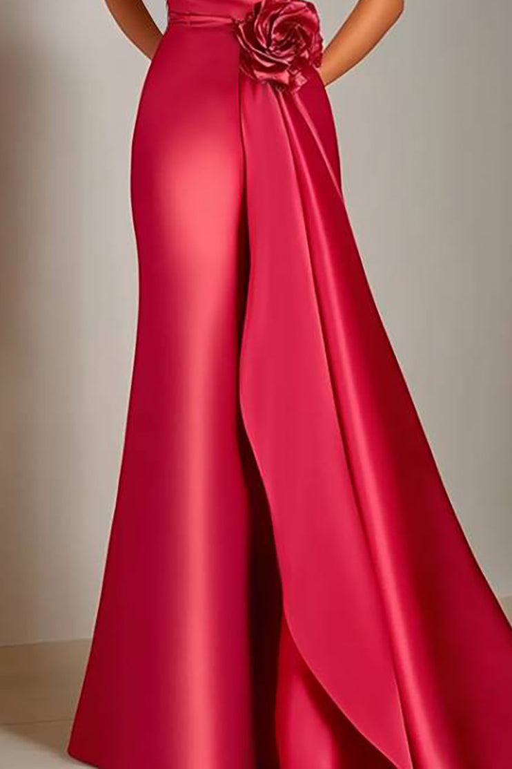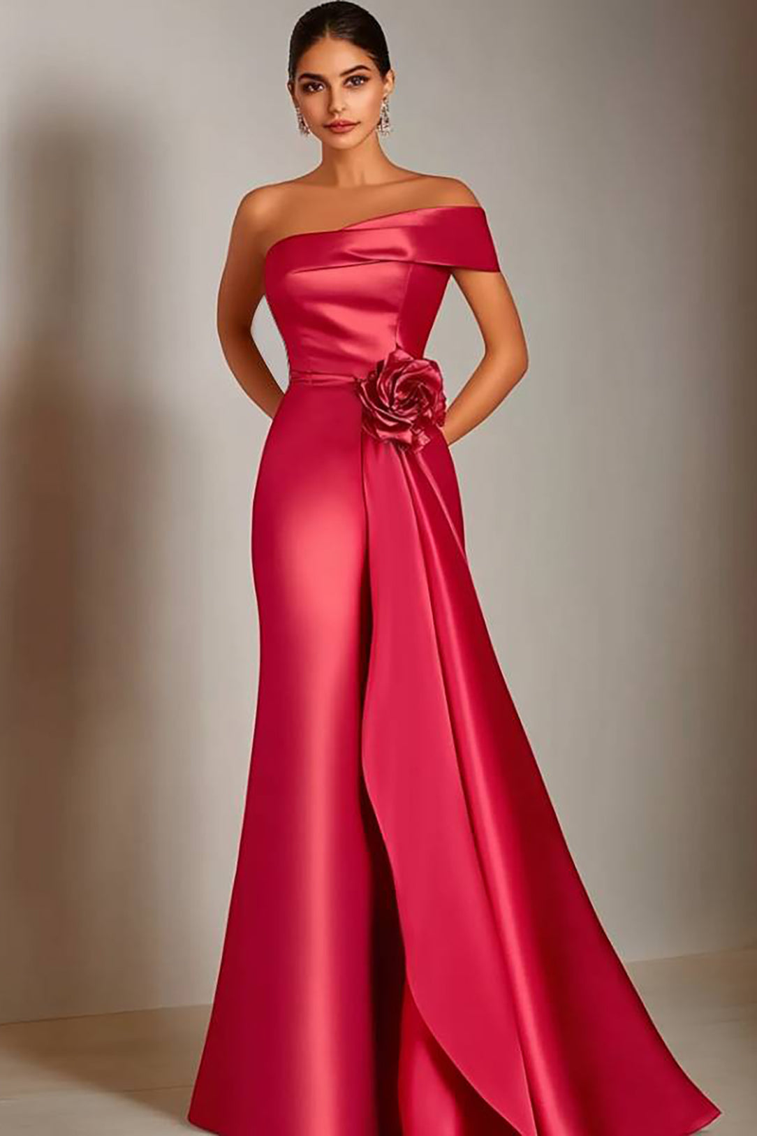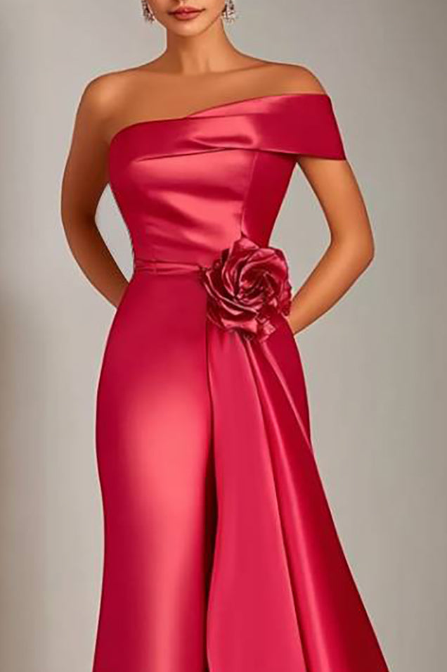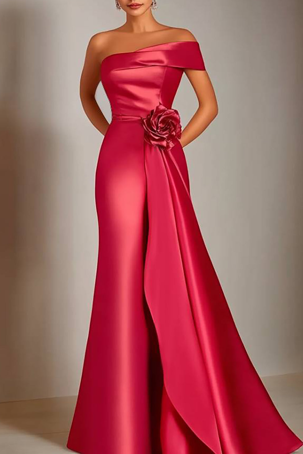 Evening Formal Satin Dress Red One Shoulder 3D Floral Draped Floor-Length Gown