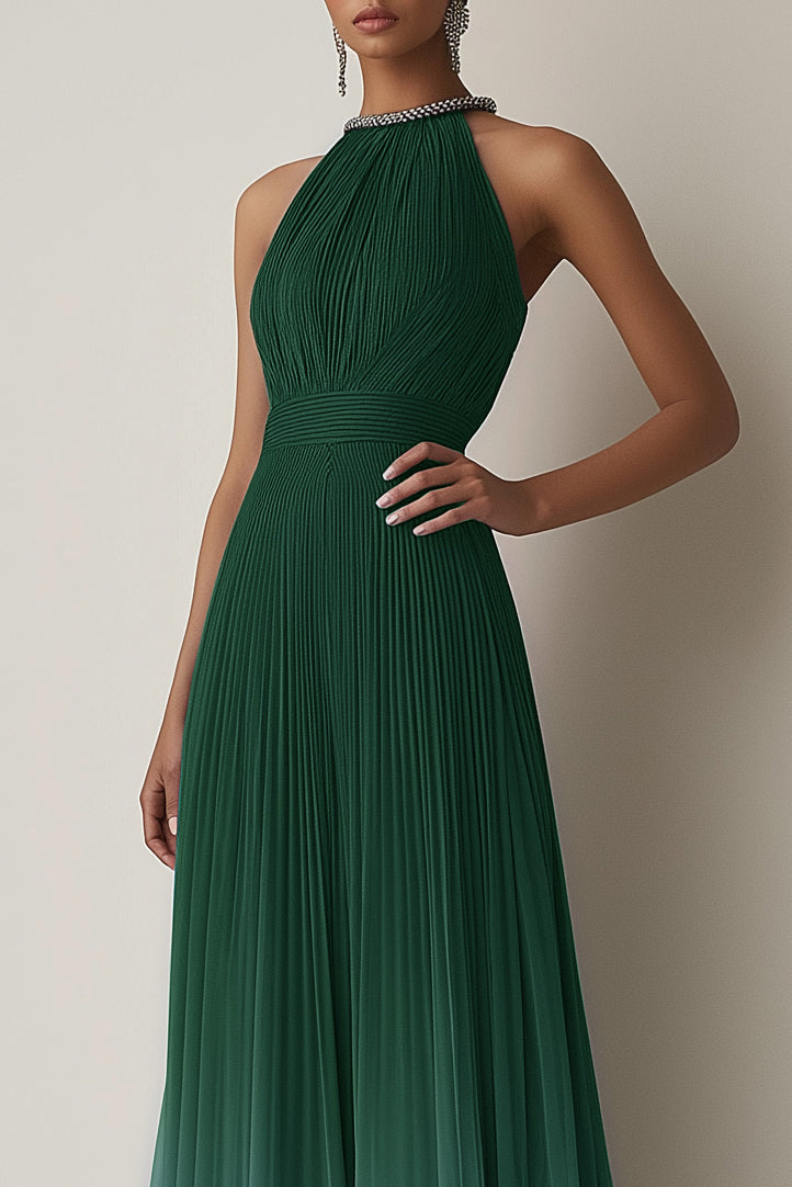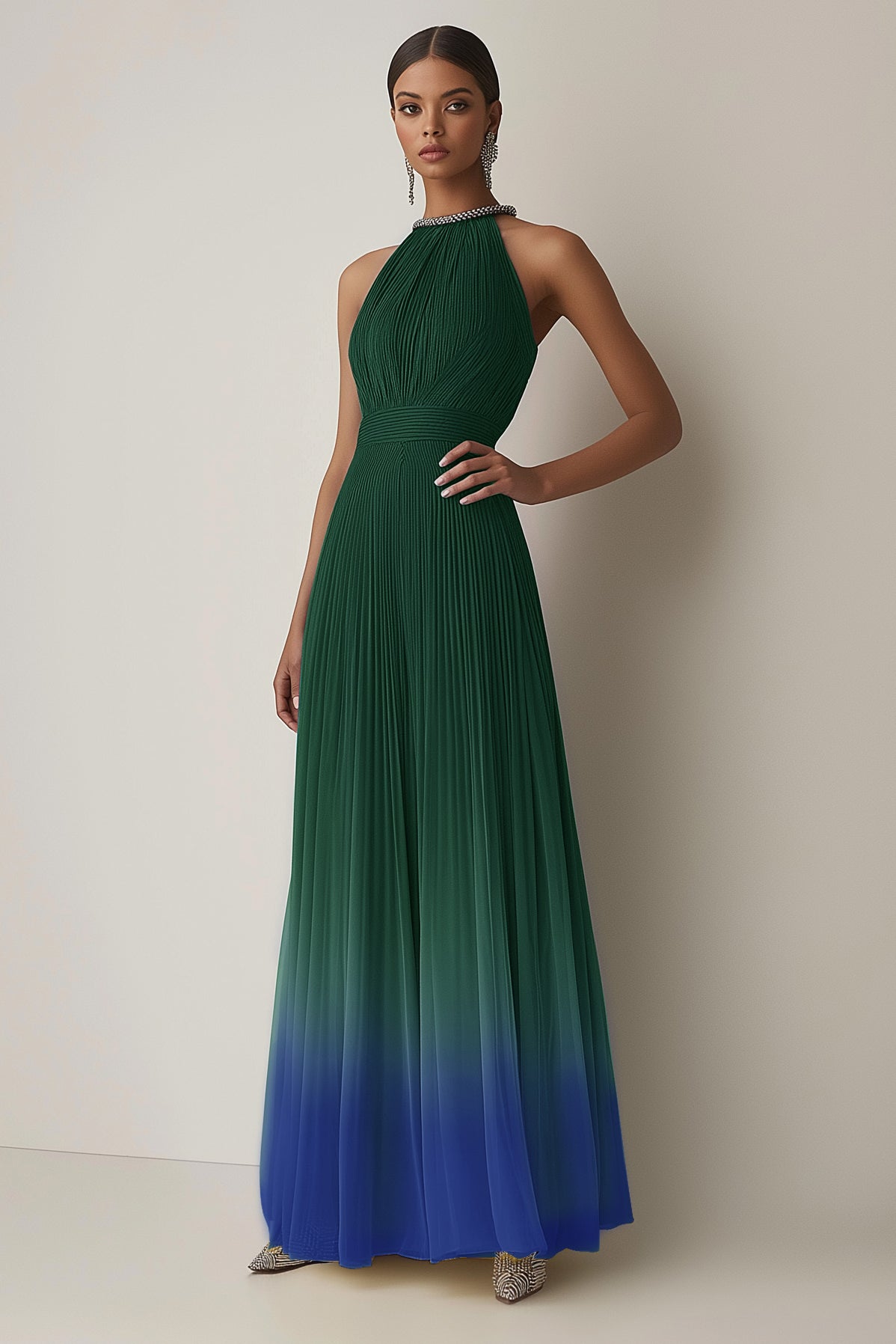 Turn heads in this stunning green-blue gradient halter dress. The pleated chiffon design cascades elegantly, making it a perfect choice for evening parties. The color transition creates a dynamic effect, giving you an unforgettable look.