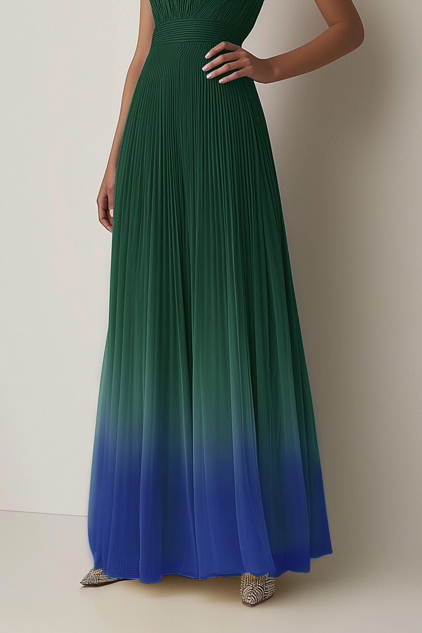 Evening Halter Dress Green-Blue Ombre Pleated Chiffon Maxi Dress