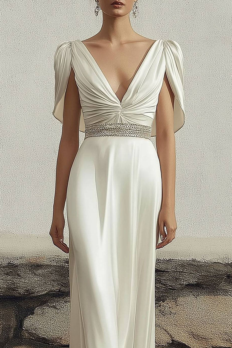 Evening Party Satin Dress White Deep V-Neck Rhinestone Belt Slit Maxi Dress