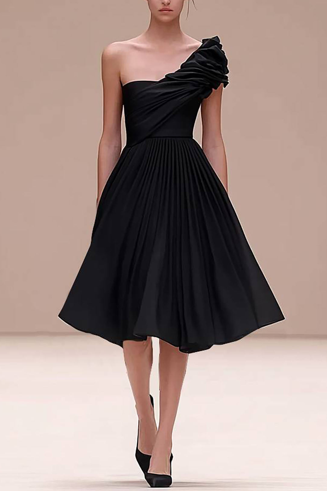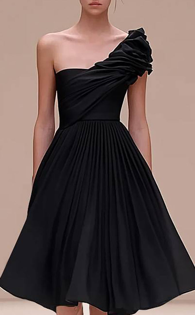 Featuring a striking one-shoulder design, elegant pleated details, and a chic knee-length silhouette, this black dress is perfect for proms, parties, or any sophisticated occasion.