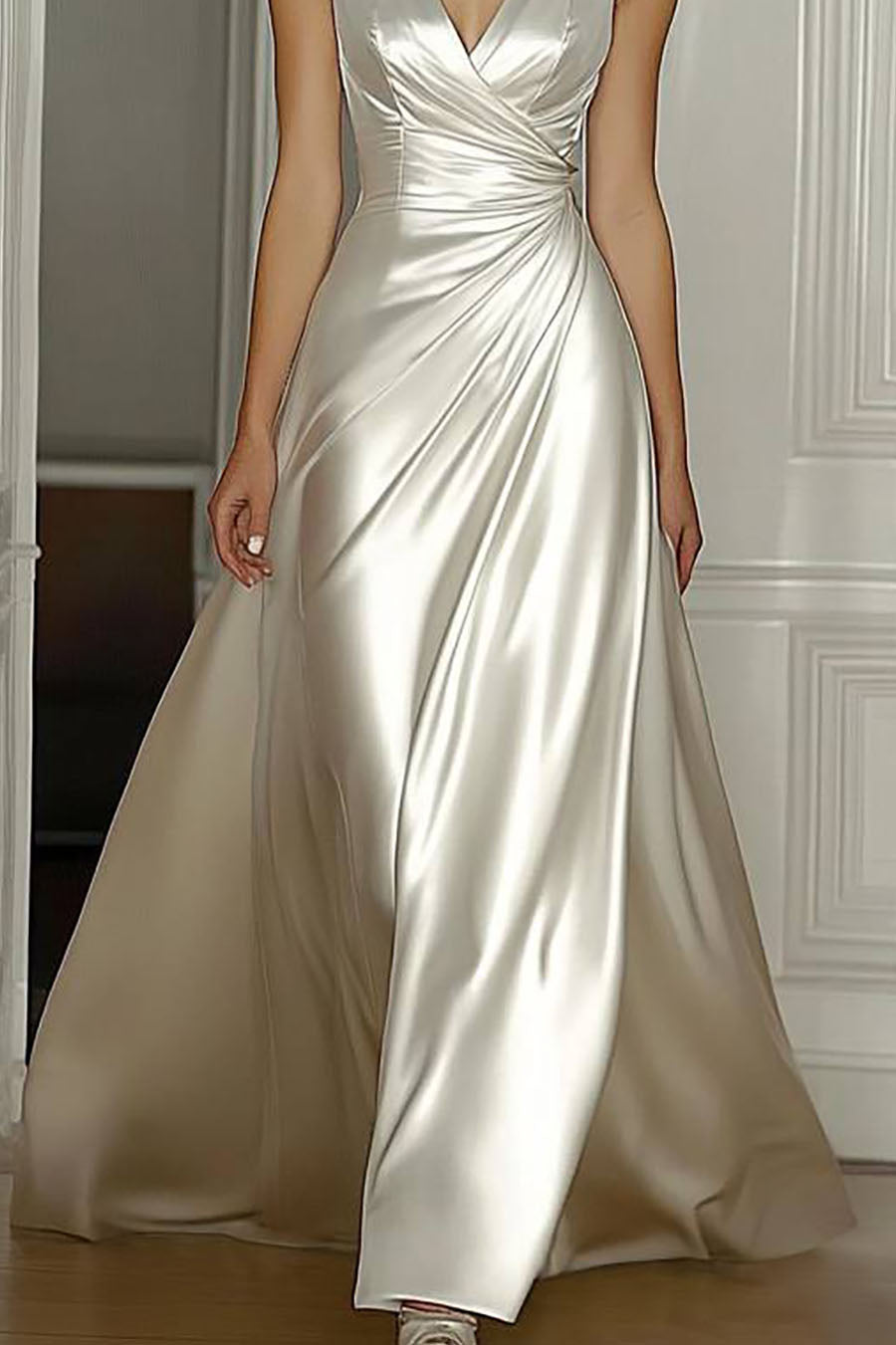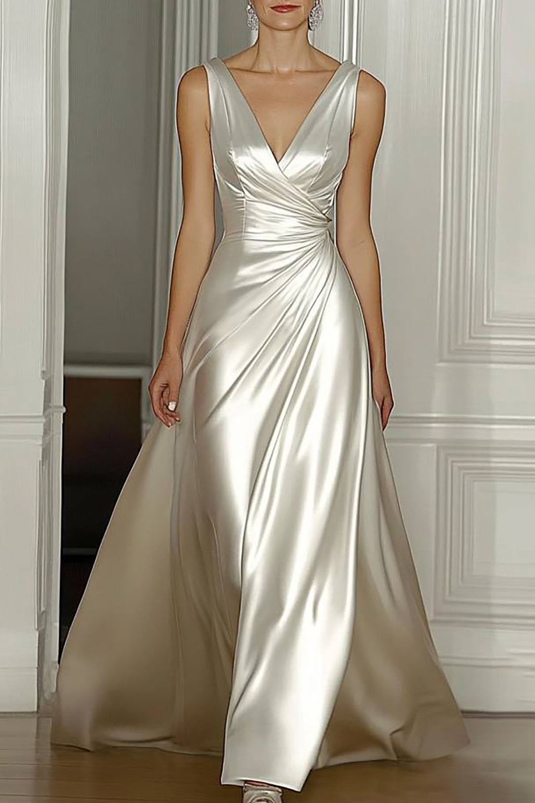 Evening Prom Satin Dress Off-White Sleeveless V-Neck Floor-Length Dress
