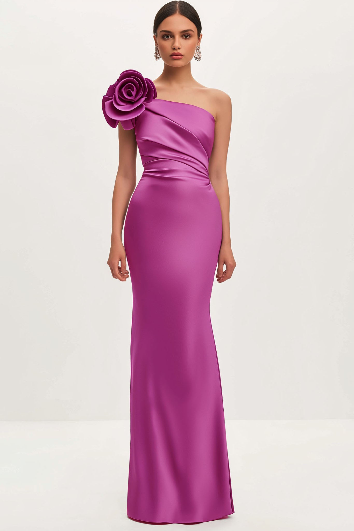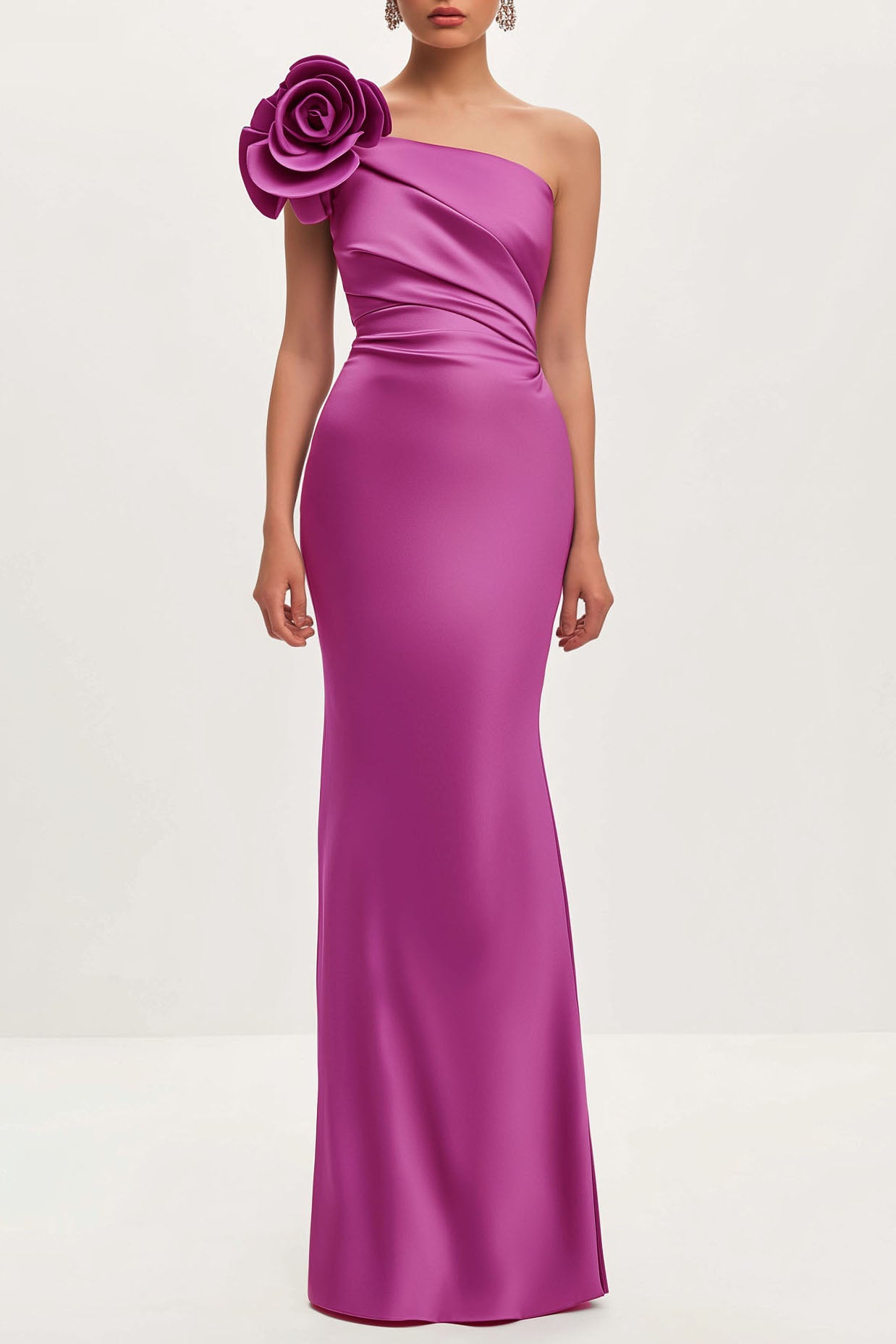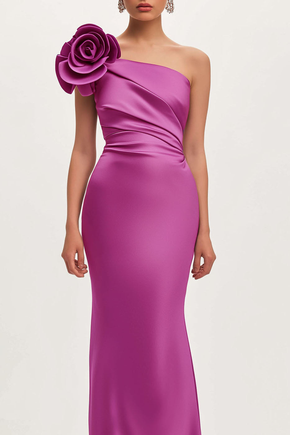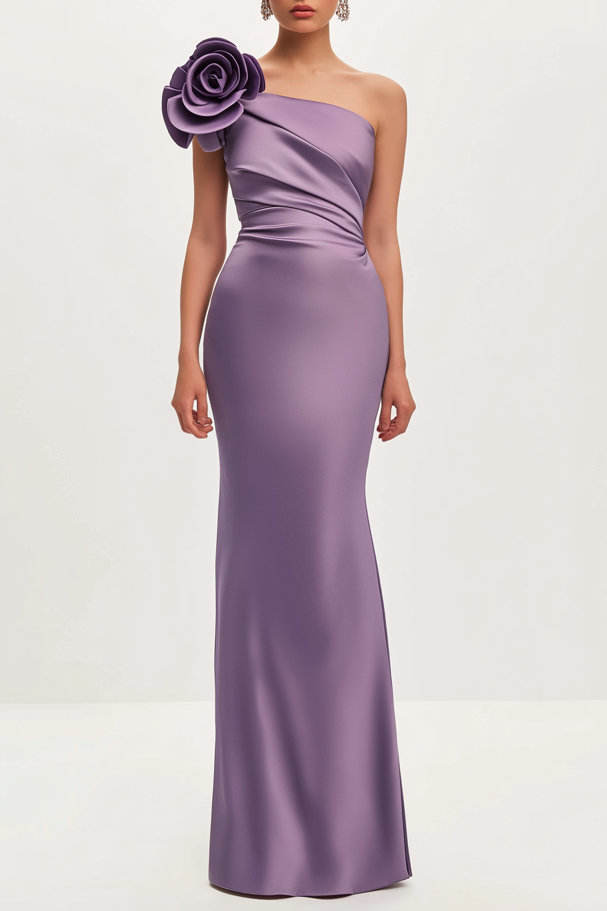 Formal Evening Satin Dress Purple One Shoulder 3D Floral Floor-Length Dress