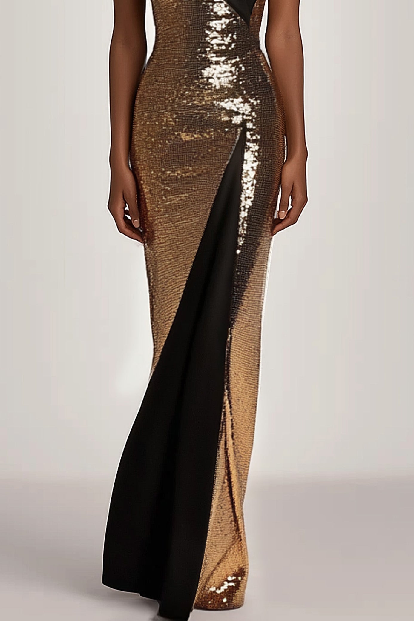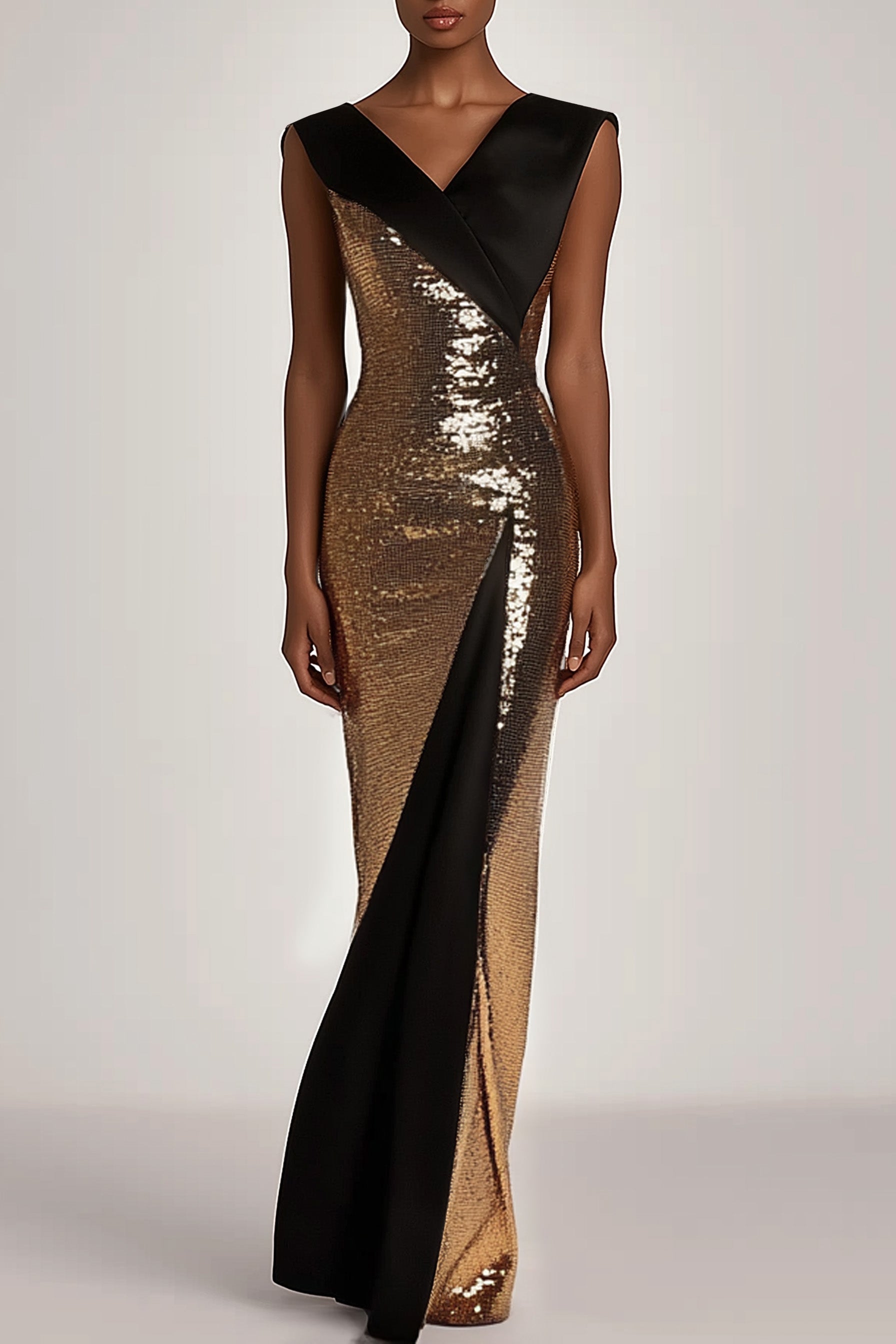 Evening Sequin Dress Black Gold Colorblock V-neck Sleeveless Maxi Gown