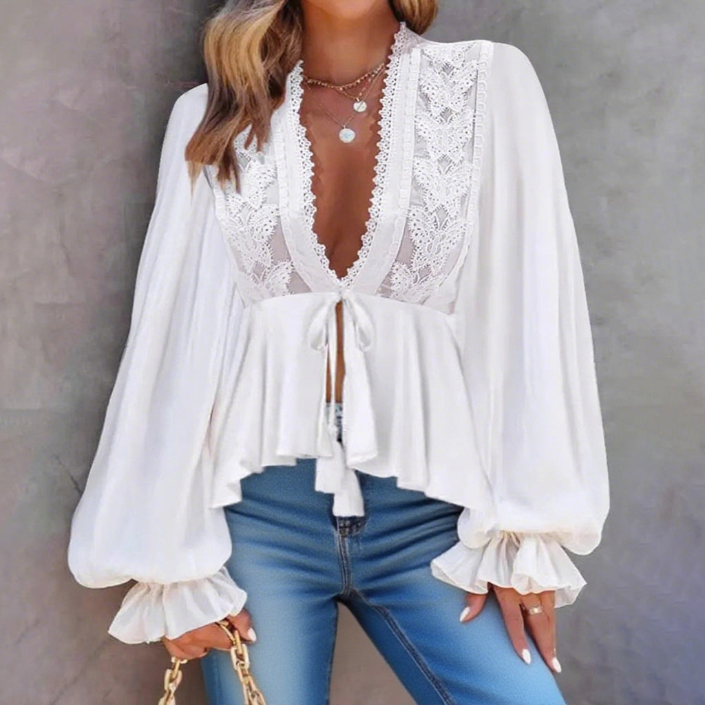 Everyday Lace Deep V Neck Lantern Sleeve Peplum Blouse