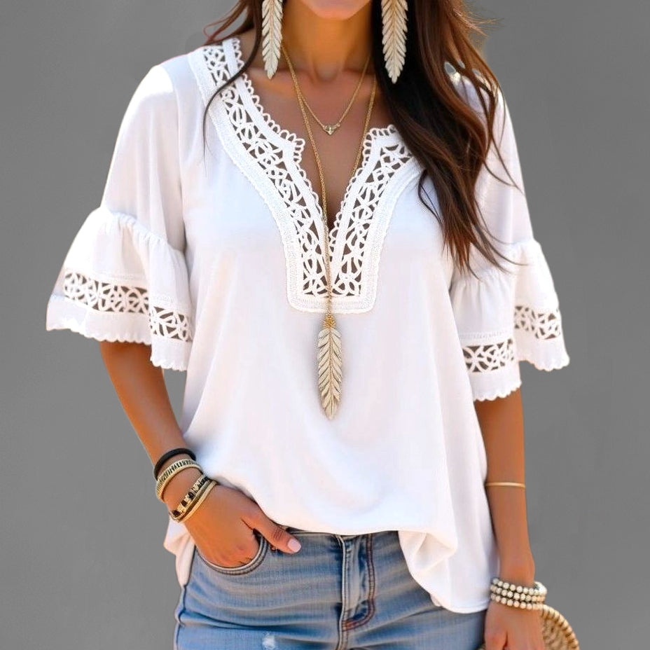 Everyday Lace Trim V Neck Flare Sleeve Blouse