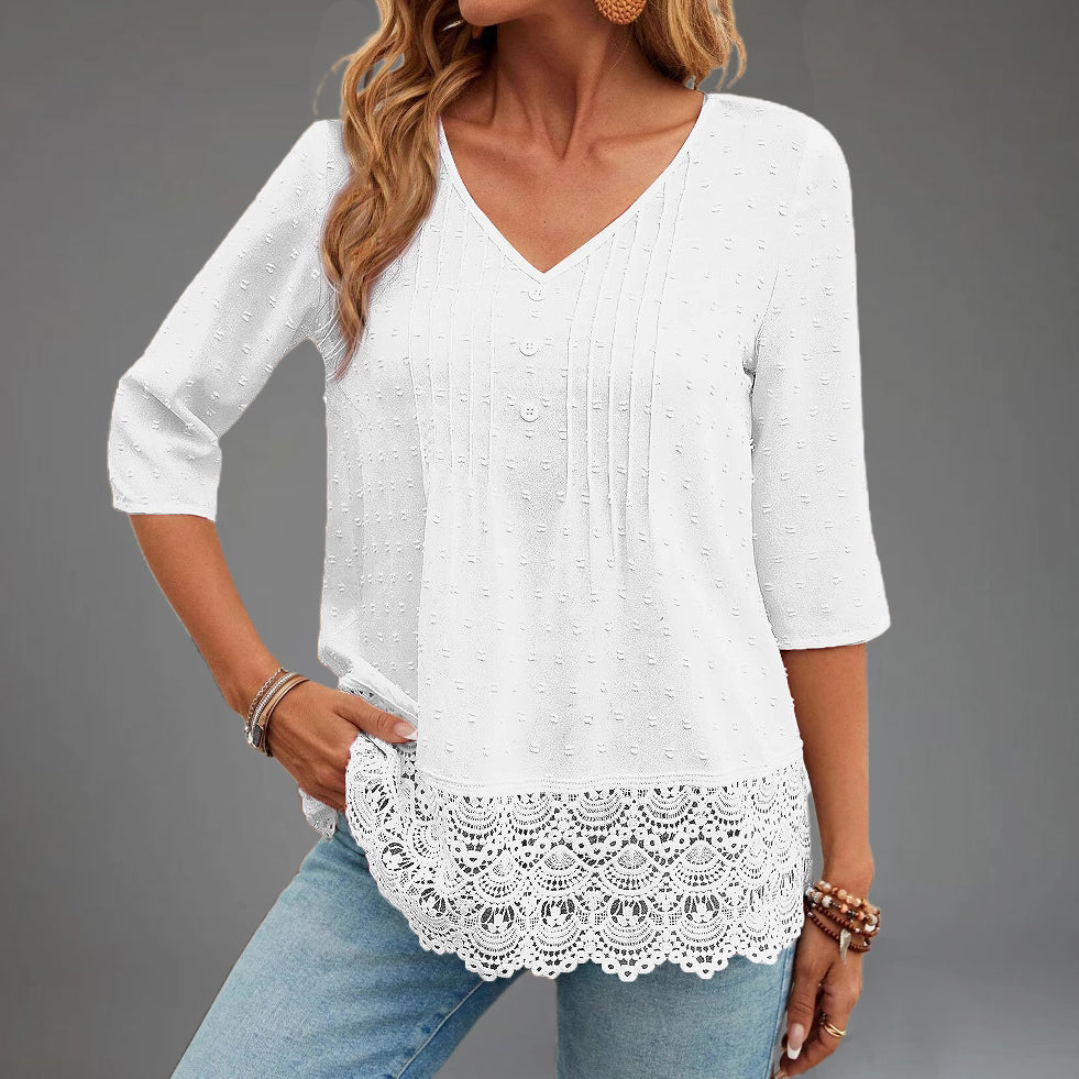 Everyday Swiss Dot V Neck 3/4 Sleeve Guipure Lace Blouse