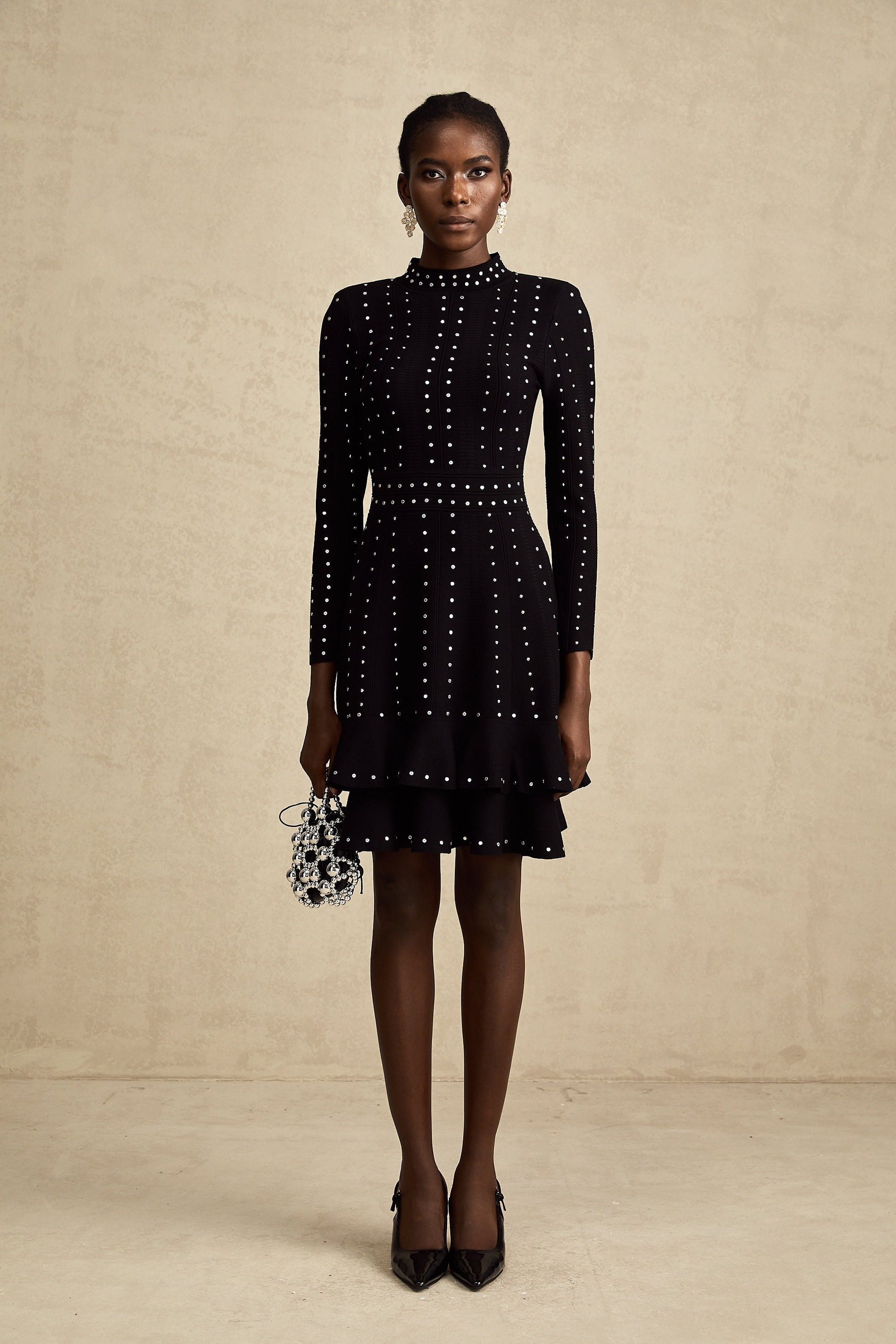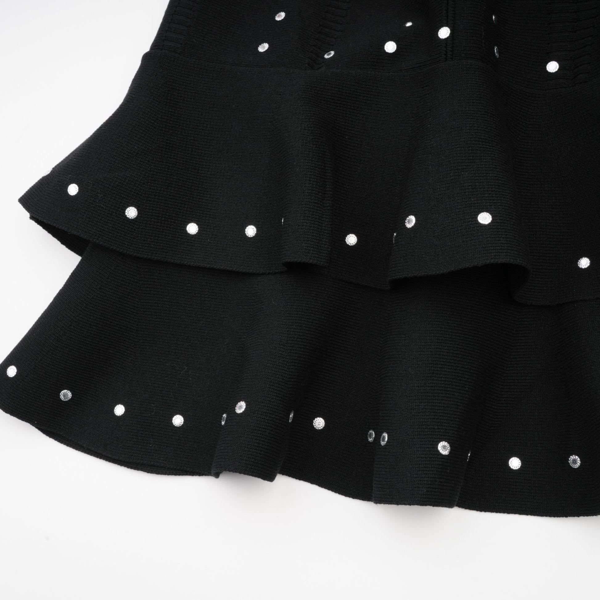 Fabienne Black Embellished Ruffled Knit Mini Dress