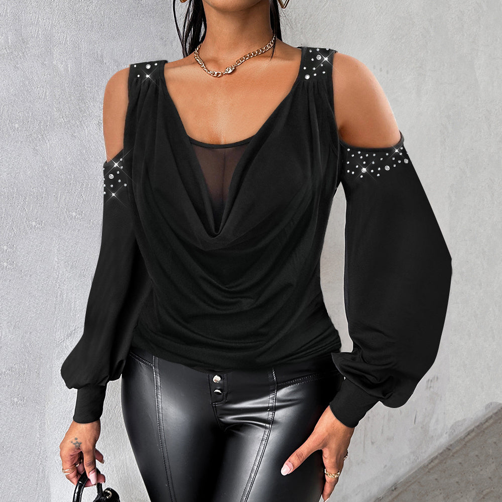 Fashion Cold Shoulder Rhinestone Mesh Drape Neck Lantern Sleeve Blouse