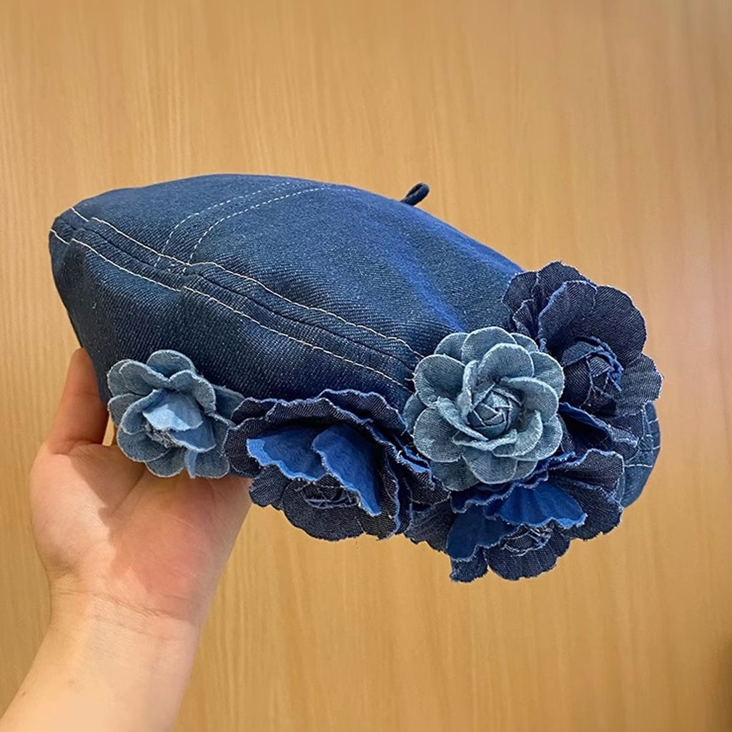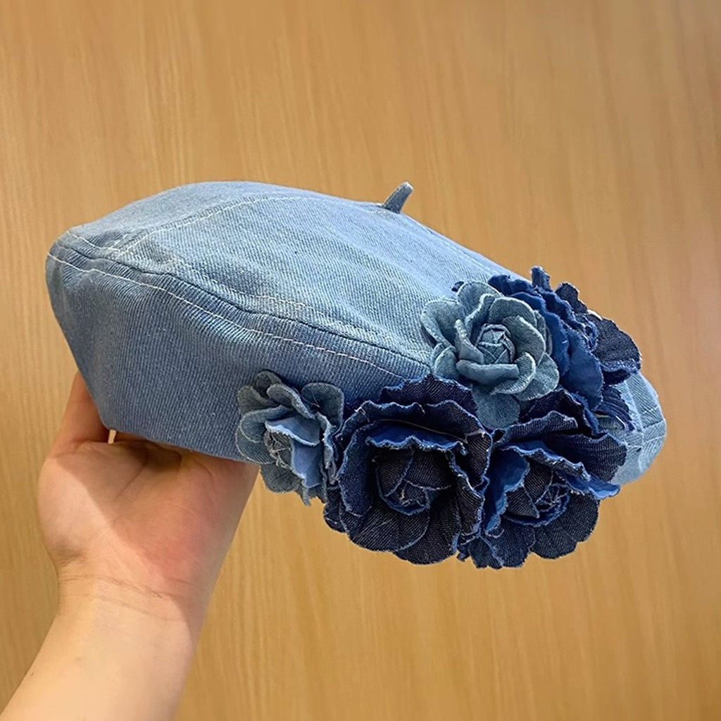 Fashion Color Block 3D Floral Denim Beret