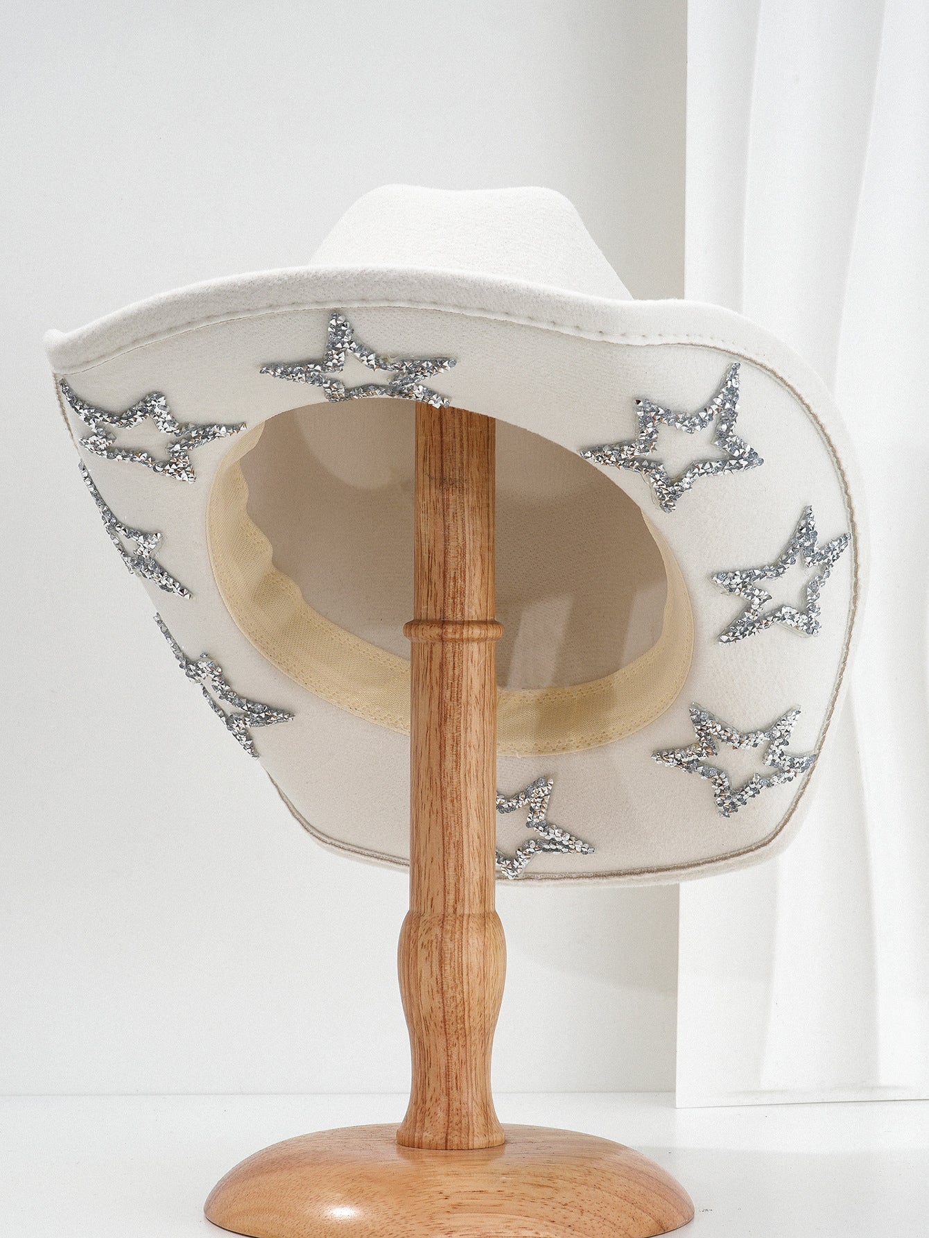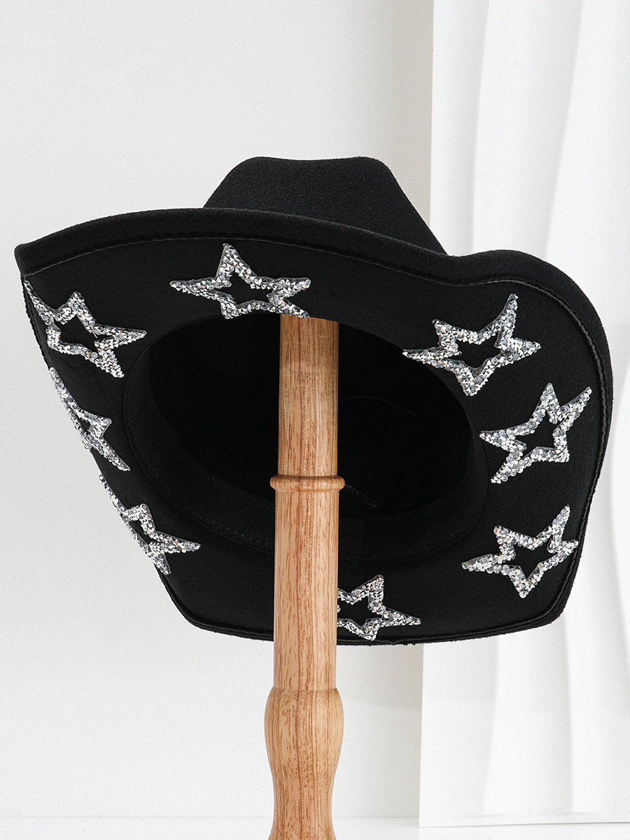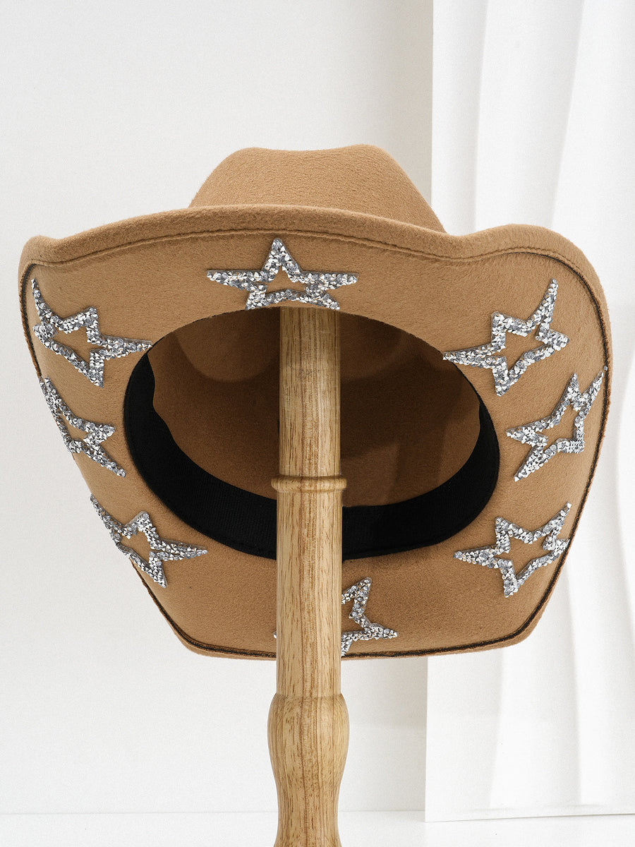 Make a bold statement with this fashion-forward retro Western cowboy hat, adorned with dazzling rhinestone diamond stars that bring a touch of glam to classic cowboy flair. Featuring a structured crown and wide curved brim, it blends traditional Western design with eye-catching decorative elements, perfect for anyone looking to stand out in style. The shimmering star embellishments catch the light effortlessly, adding sparkle and personality to your look whether you're at a festival, rodeo, or country-chic event.