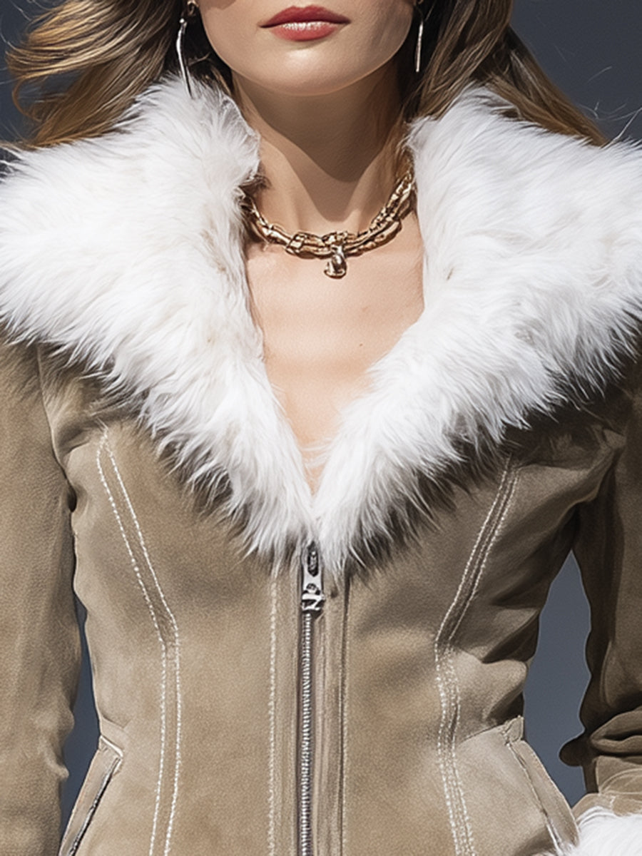 Fashion Vintage Plush Trim Khaki Faux Suede Zipper Jacket