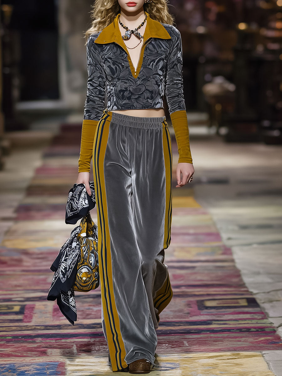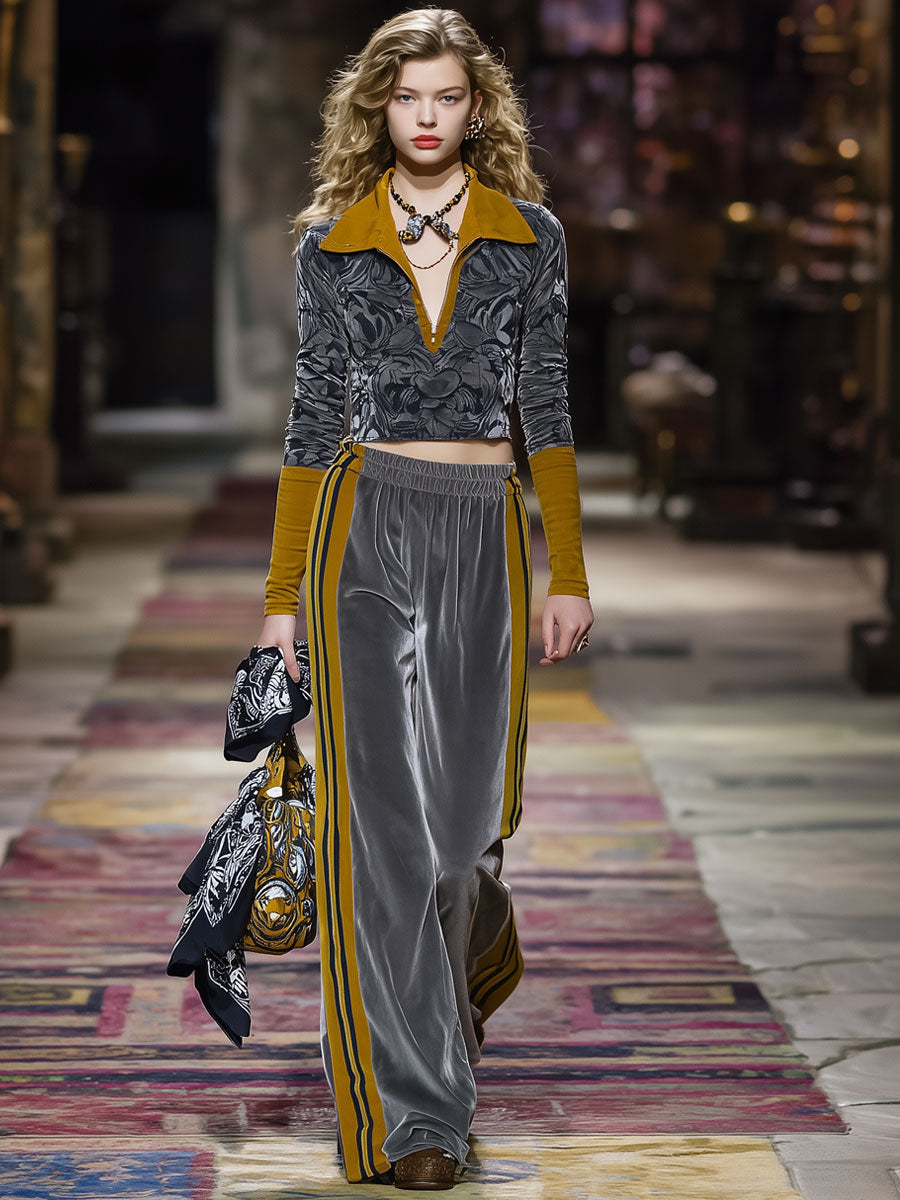 Fashionable Silver Velvet Embossed Polo Shirt Wide-Leg Pants Sports Set