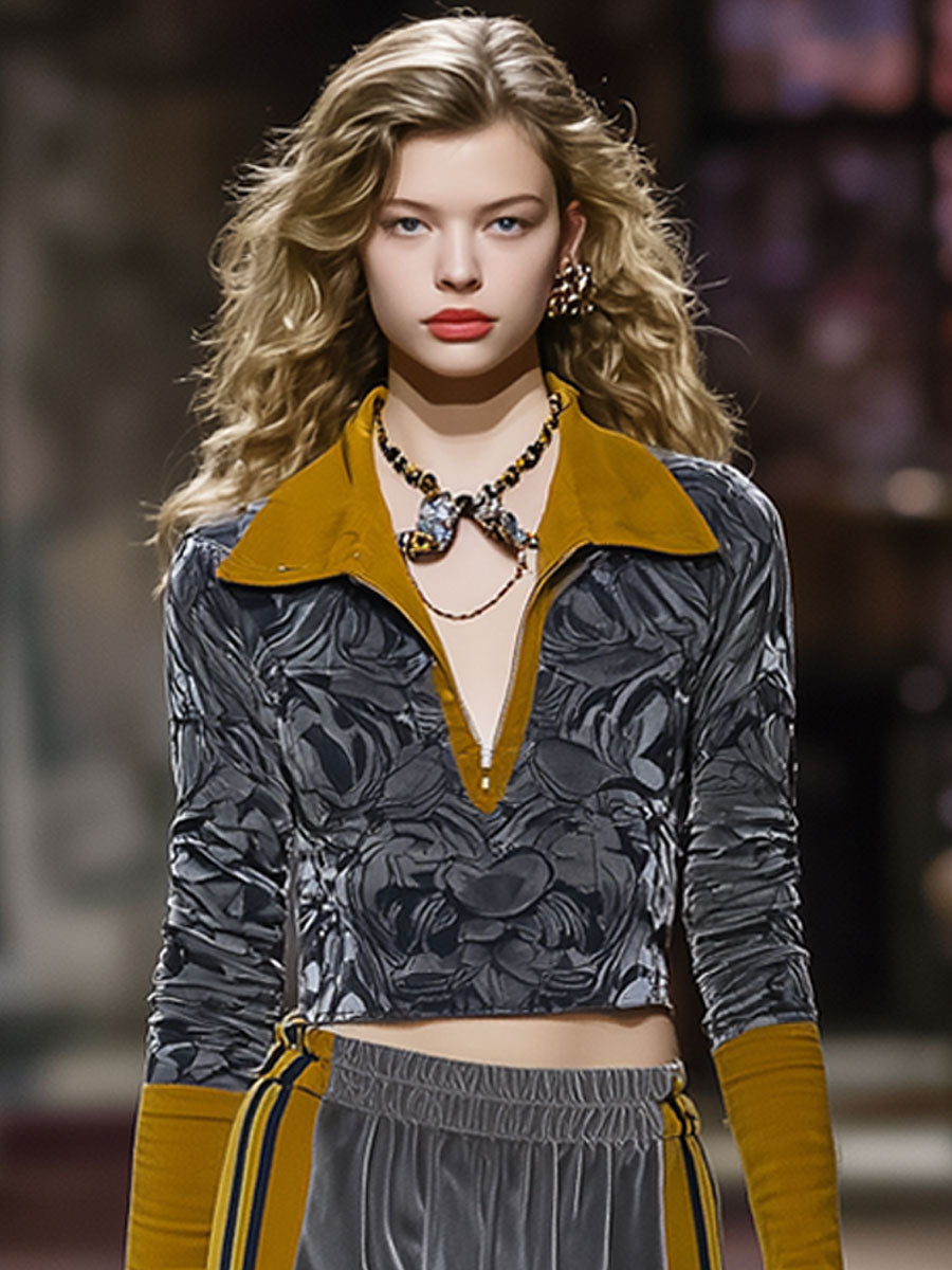 This fashionable silver velvet embossed polo shirt and wide-leg pants sports set is a stunning blend of comfort and chic style that takes athleisure to the next level. The silver velvet fabric not only exudes luxury but also adds a touch of sophistication, making it suitable for both casual outings and more elevated settings. The embossed design brings a unique texture and visual interest, ensuring you stand out effortlessly.