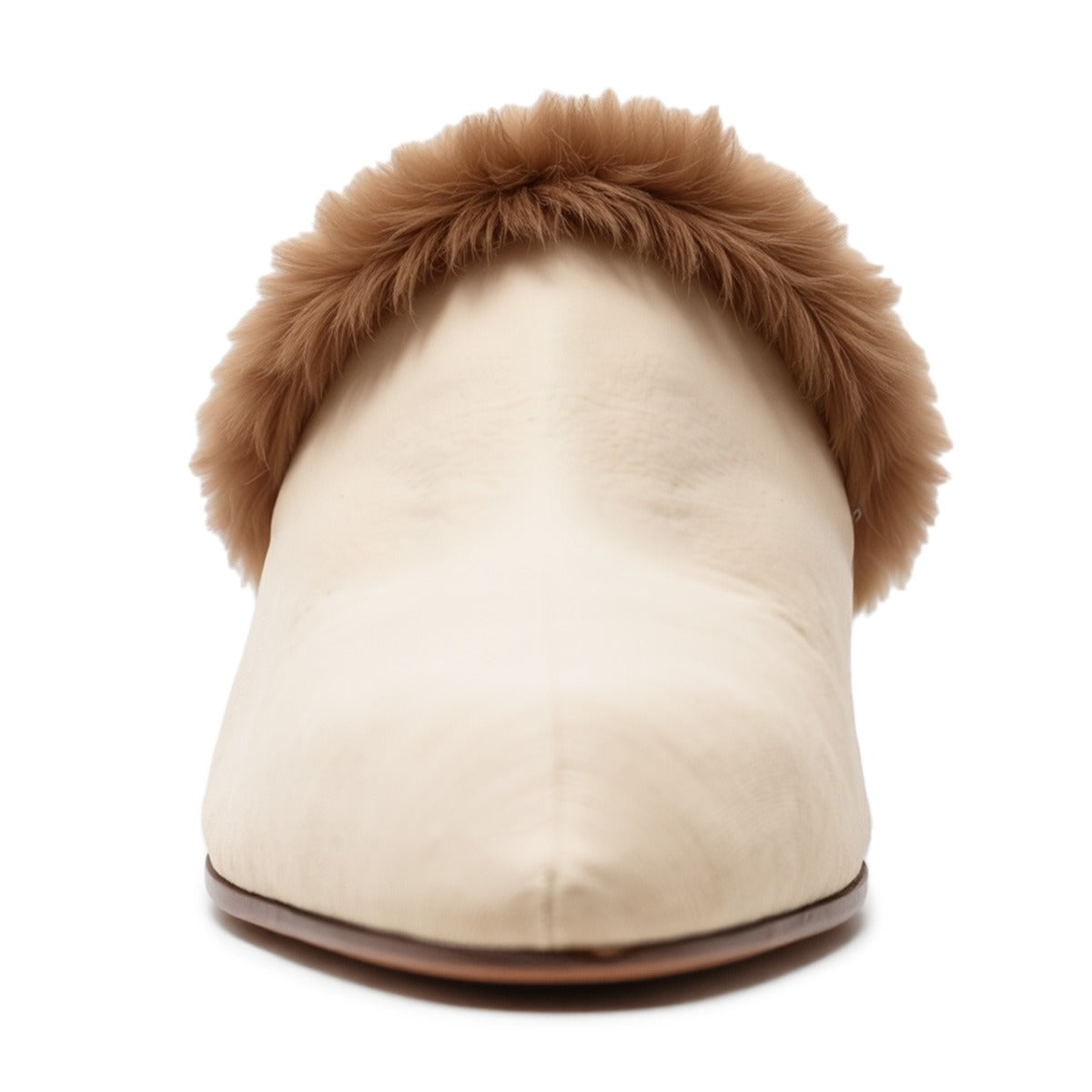 Faux Fur Trim Closed-Toe Block Heel Mule Shoes for Women in Nude