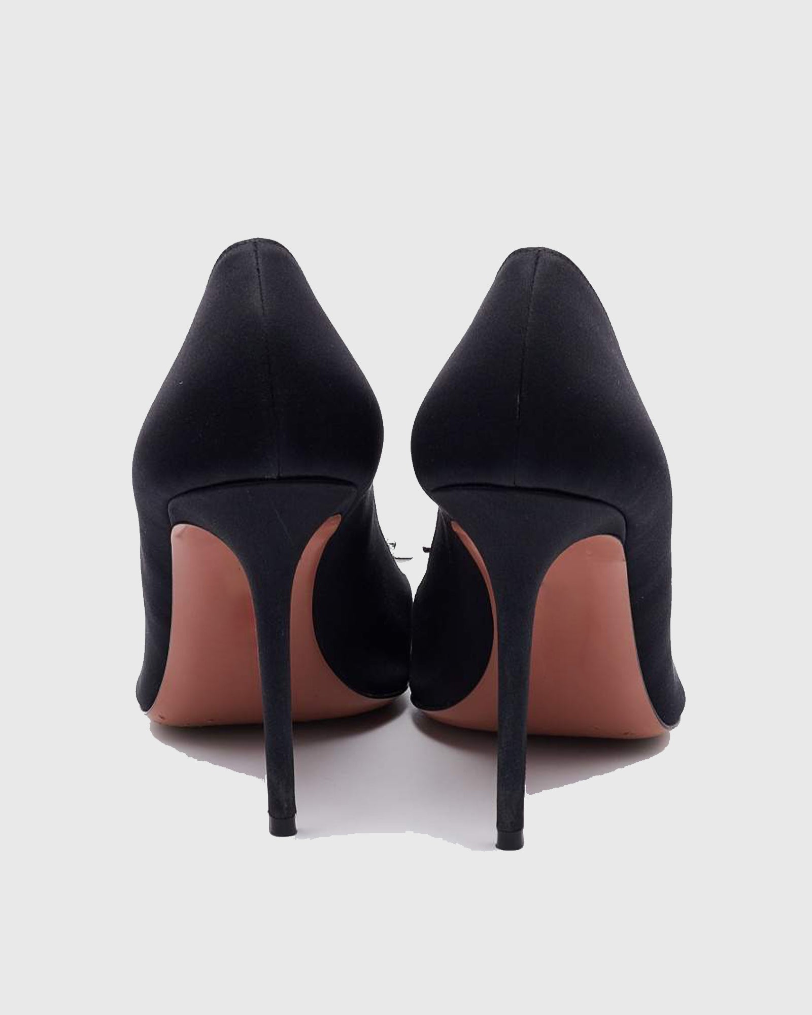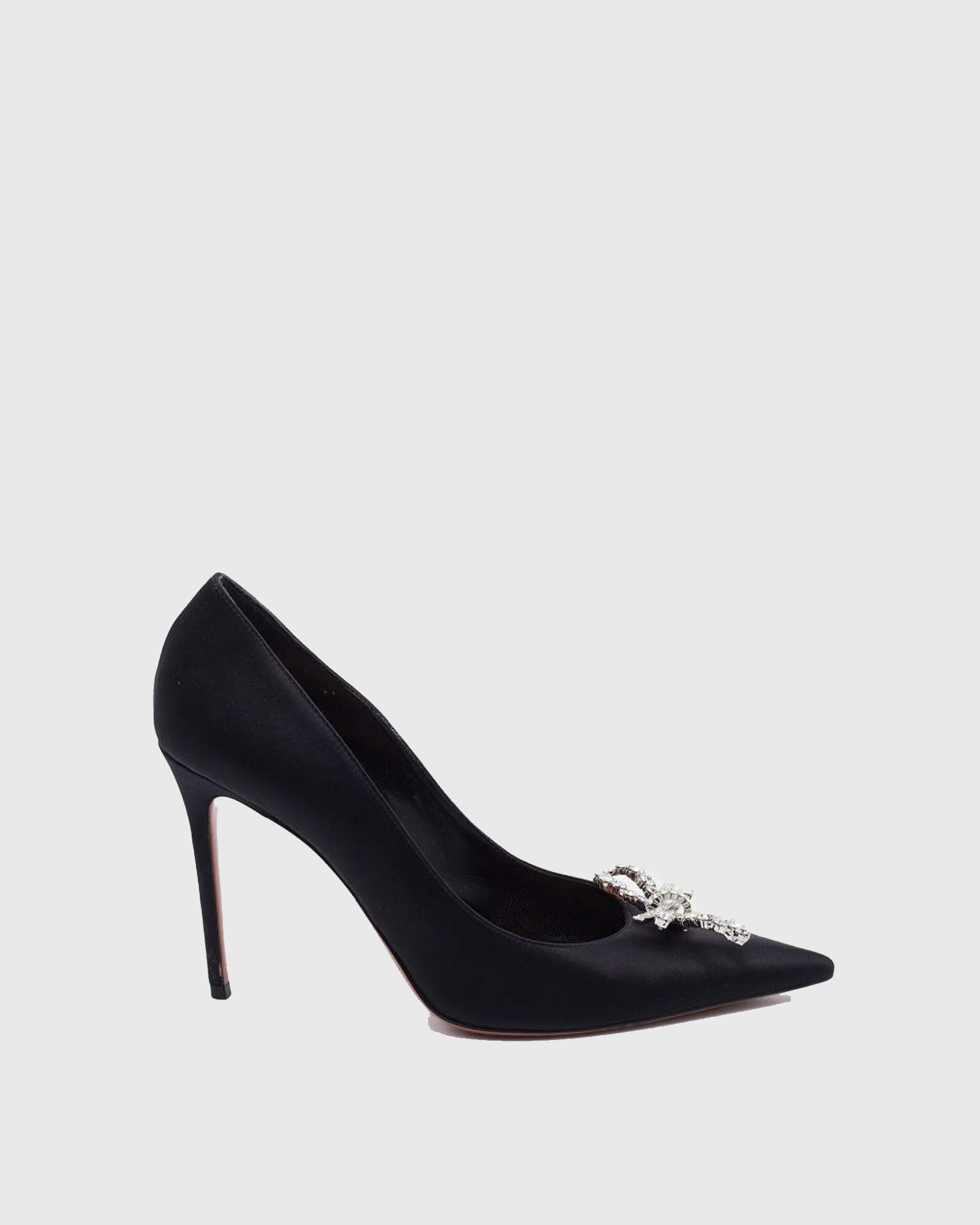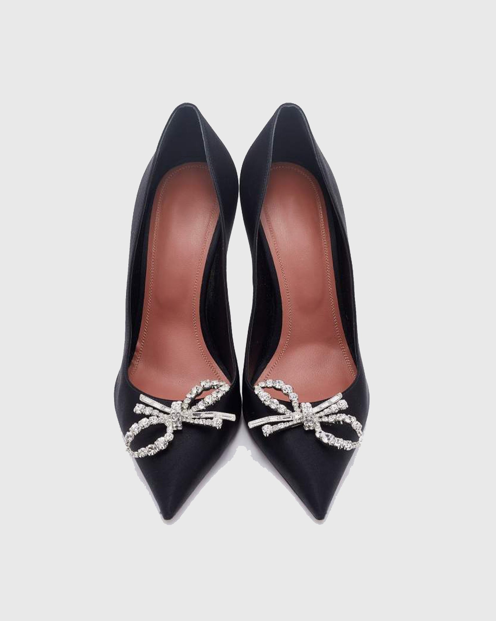 - Amina Muaddi satin pumps with crystal embellished bow accent