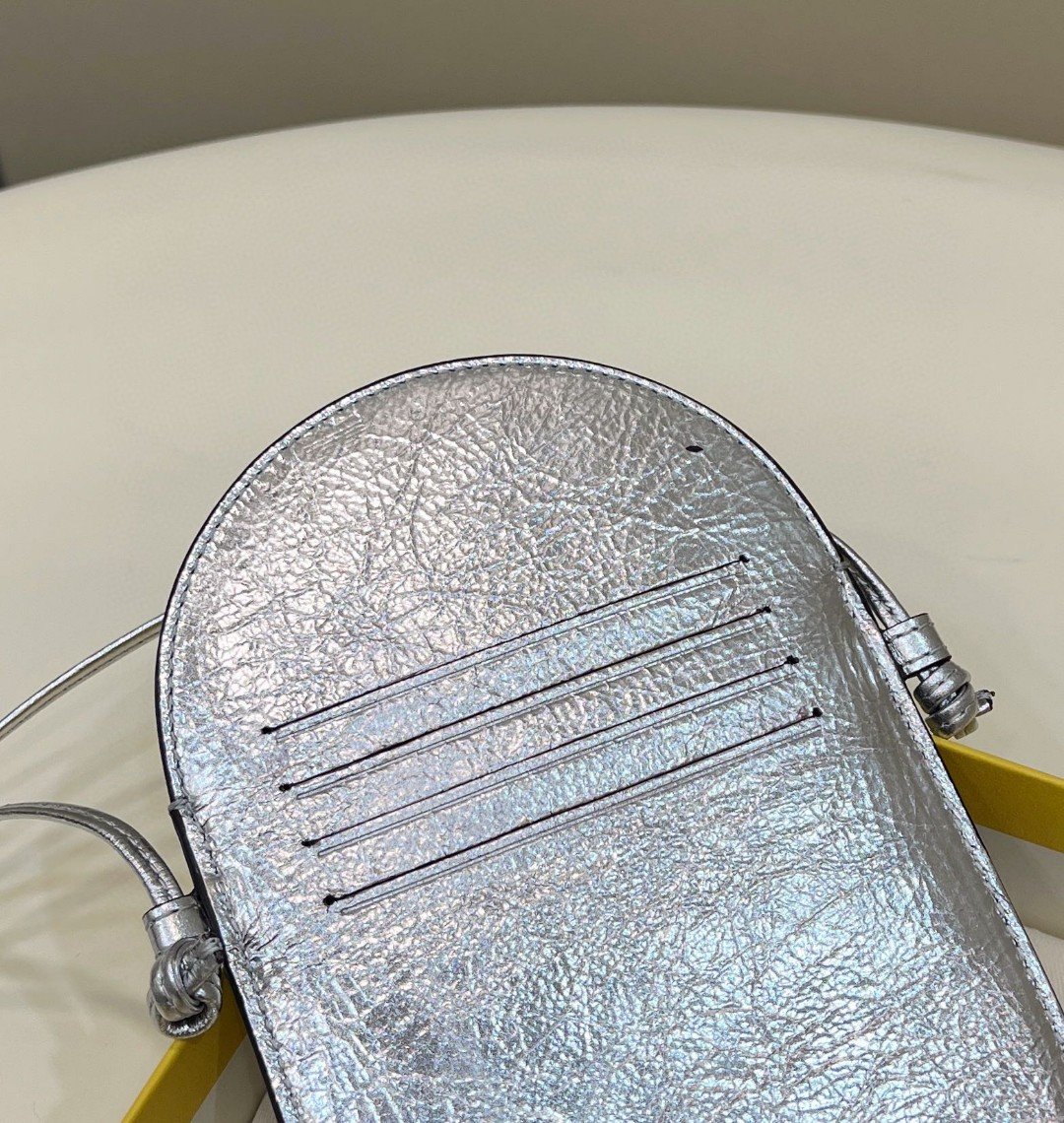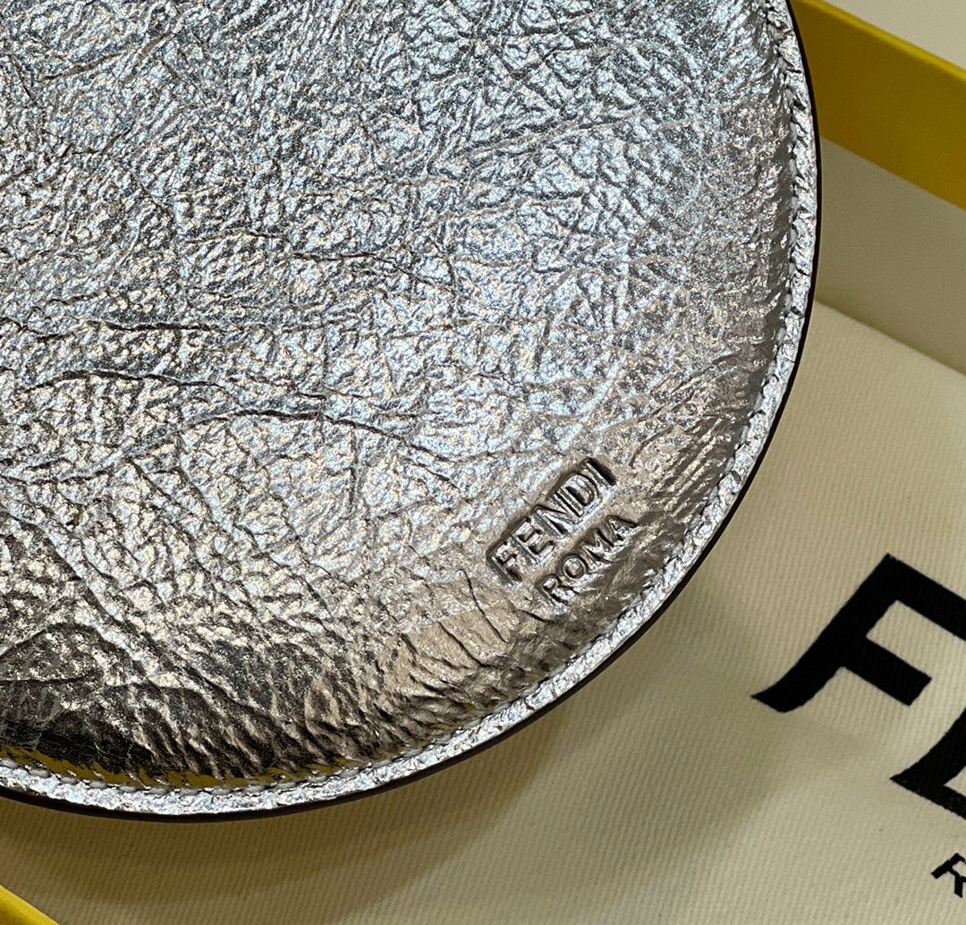 FND O’Lock smartphone case with strap and zip fastening. Card holder pockets on the back. Made of laminated silver leather with a craquelé effect. Palladium-finish metalware.