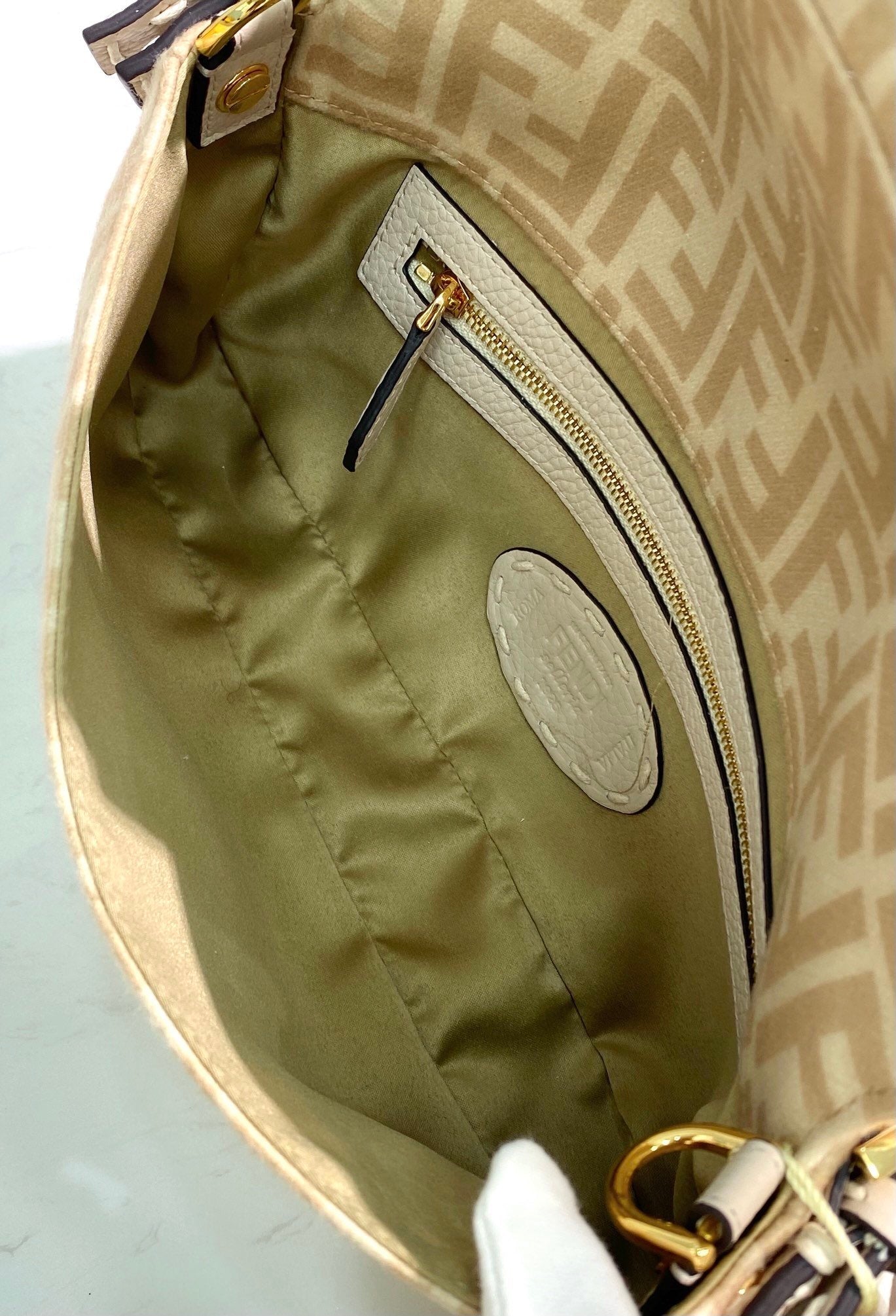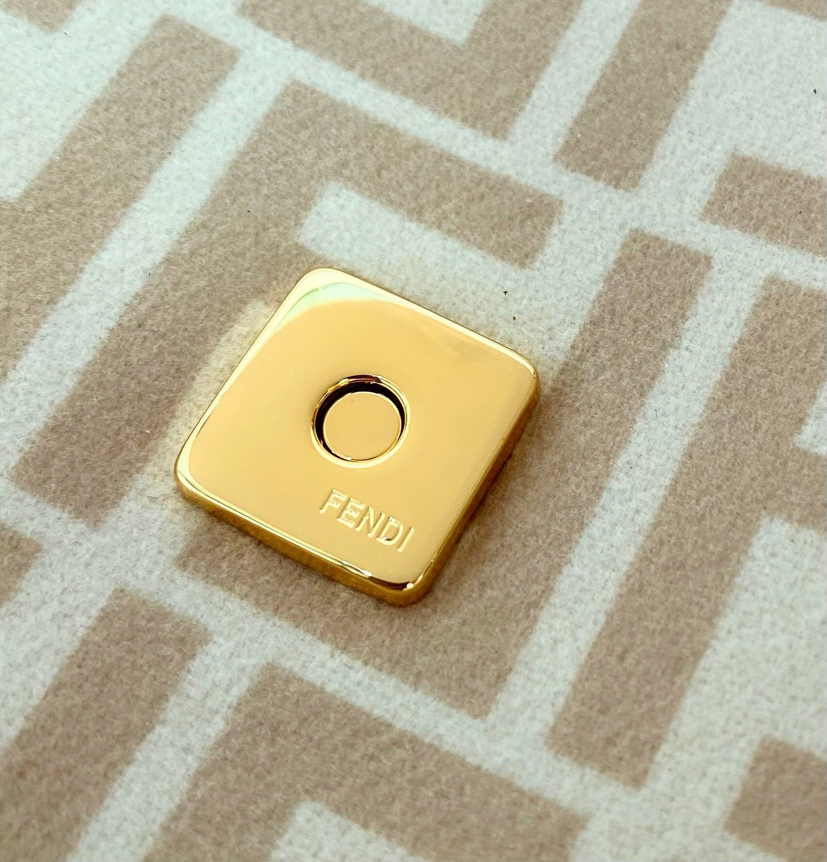 Medium Baguette 1997 bag made of wool with beige FF motif, embellished with an FF clasp. This style is a re-release of the first FND Baguette bag created in 1997, from which it takes its name and iconic ‘under the arm’ design. It can be carried on the shoulder or in the hand or as a pochette thanks to the folding, detachable handle.