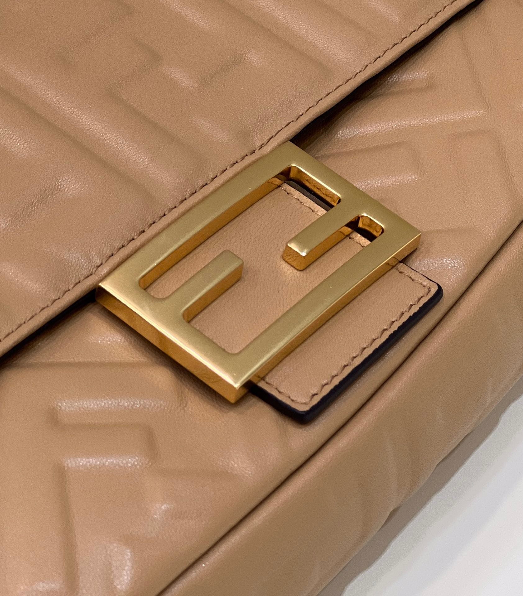 Iconic medium Baguette bag made of light brown soft nappa with a three-dimensional texture FF motif. The bag can be carried by hand, or worn either on the shoulder or cross-body thanks to the handle and shoulder strap, both detachable.