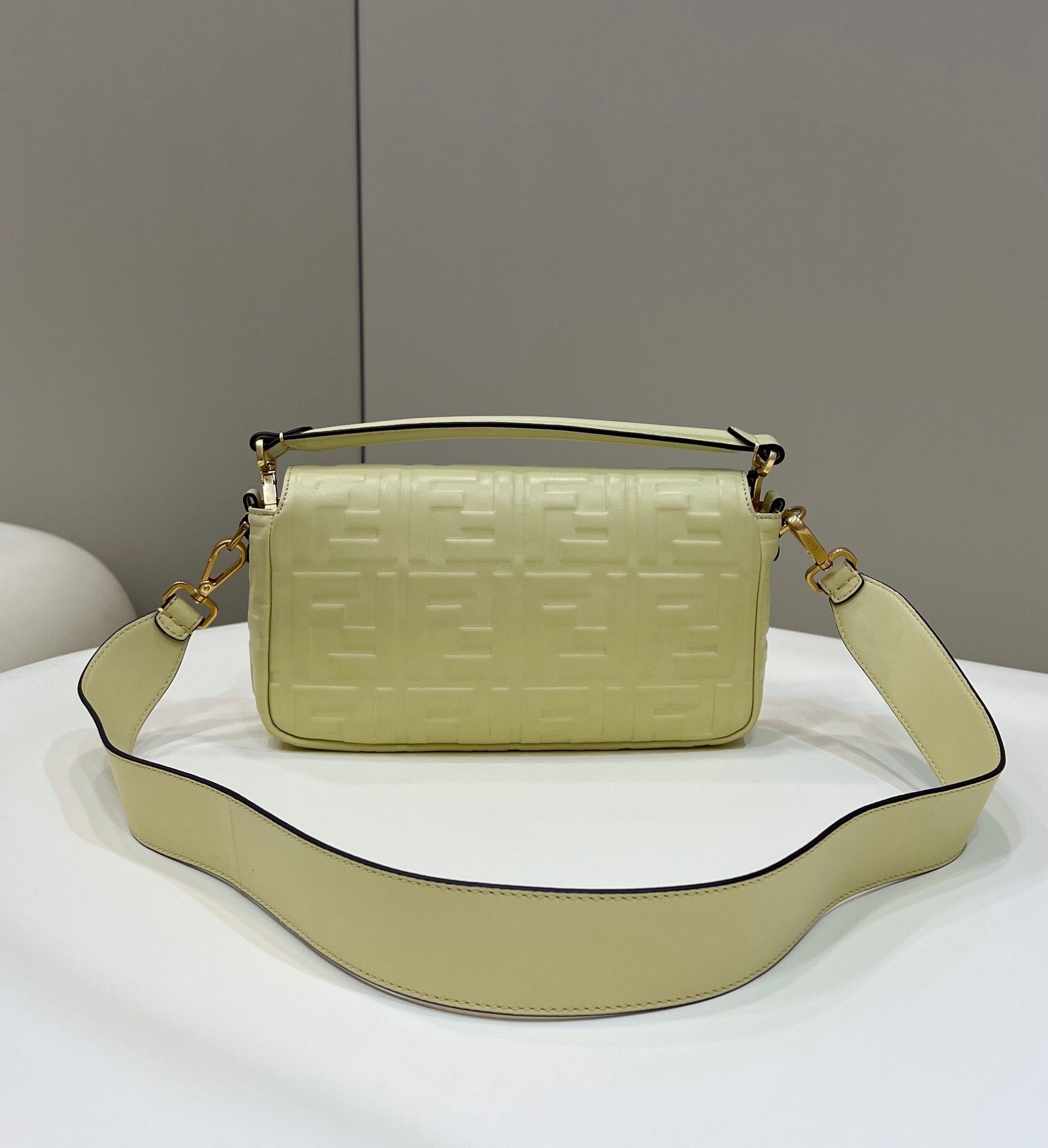 Iconic medium Baguette bag made of khaki soft nappa with a three-dimensional texture FF motif. The bag can be carried by hand, or worn either on the shoulder or cross-body thanks to the handle and shoulder strap, both detachable.