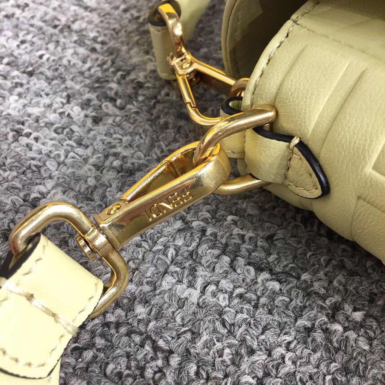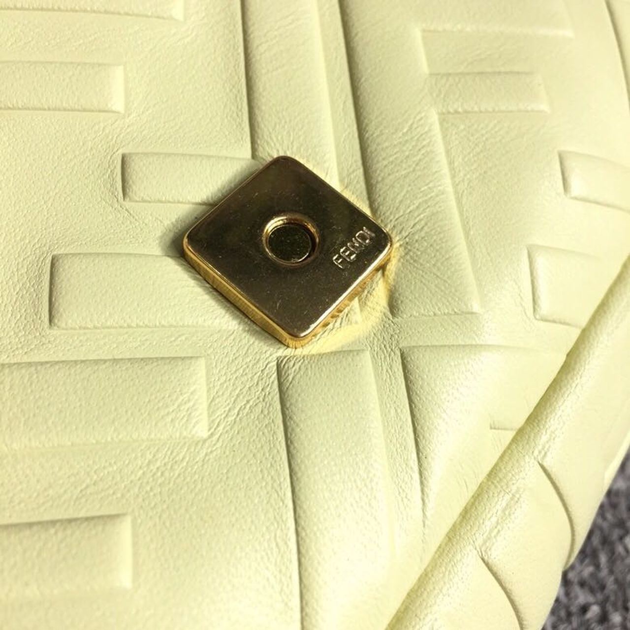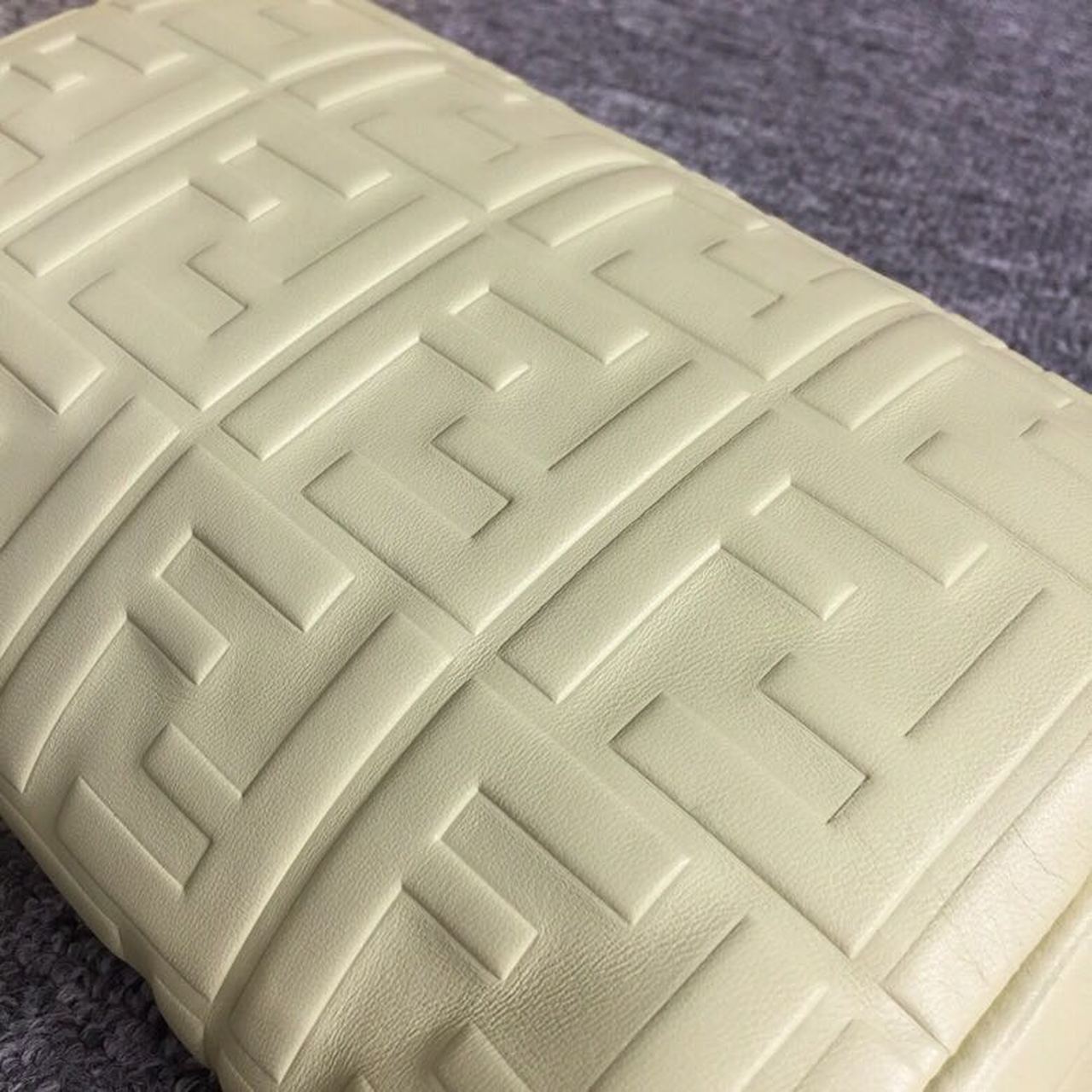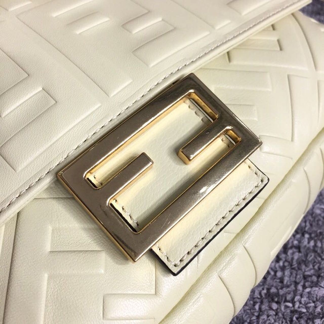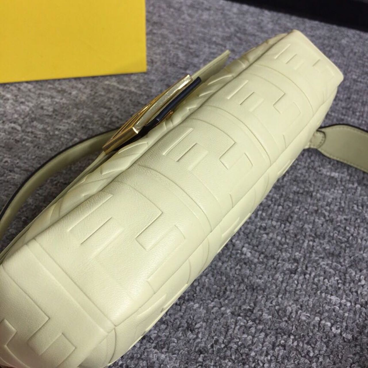 Iconic medium Baguette bag made of cream soft nappa with a three-dimensional texture FF motif. Decorated with an FF clasp. The bag can be carried by hand, or worn either on the shoulder or cross-body thanks to the handle and shoulder strap, both detachable.