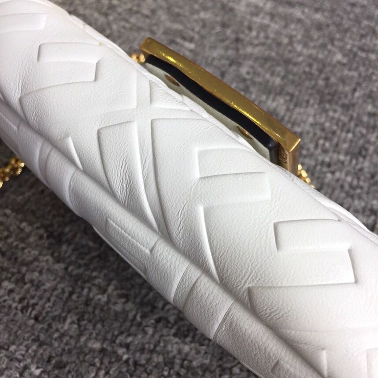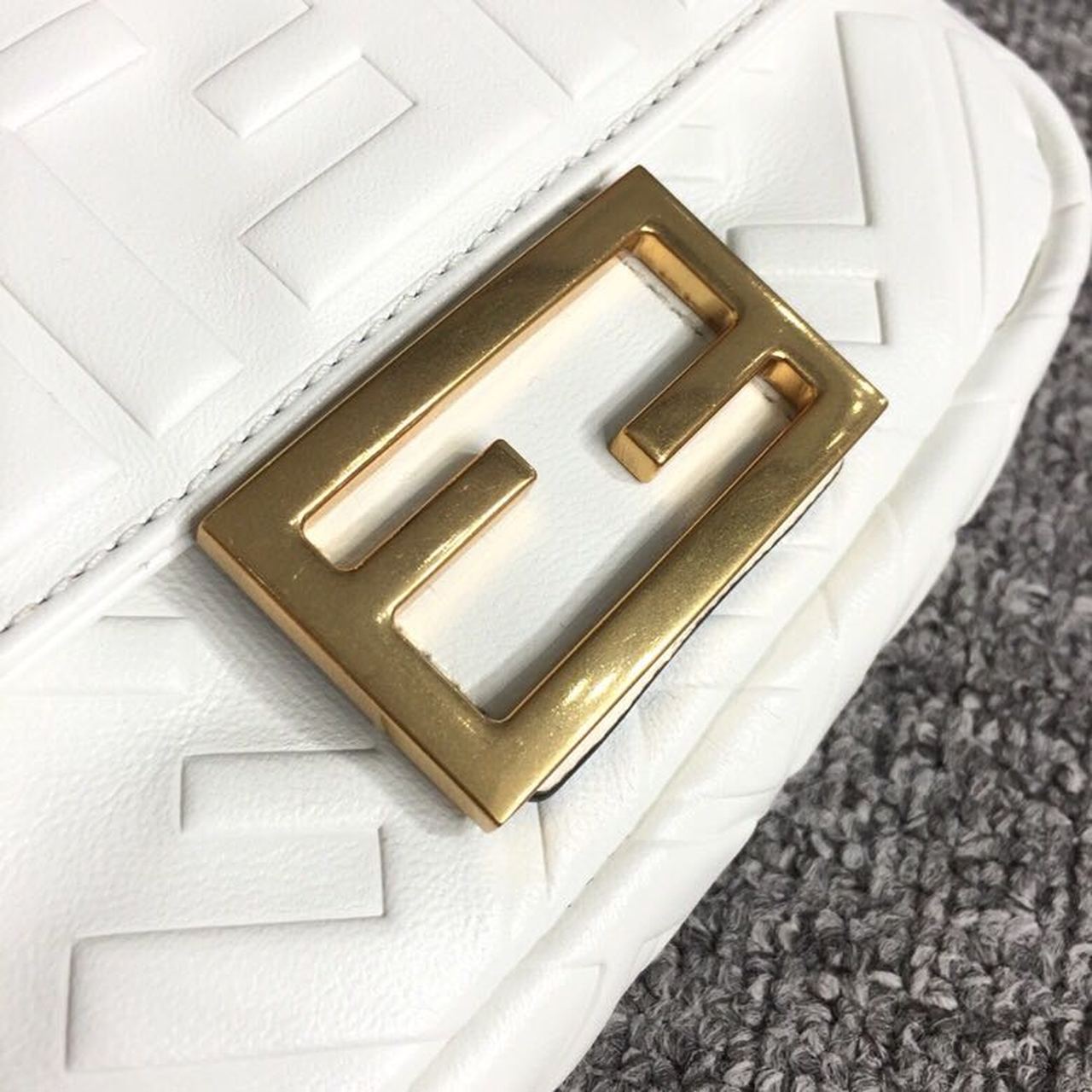 Iconic mini Baguette bag made of white soft nappa with a three-dimensional texture FF motif. Decorated with an FF clasp. The bag can be carried by hand, or worn either on the shoulder or cross-body thanks to the handle and chain shoulder strap, both detachable.