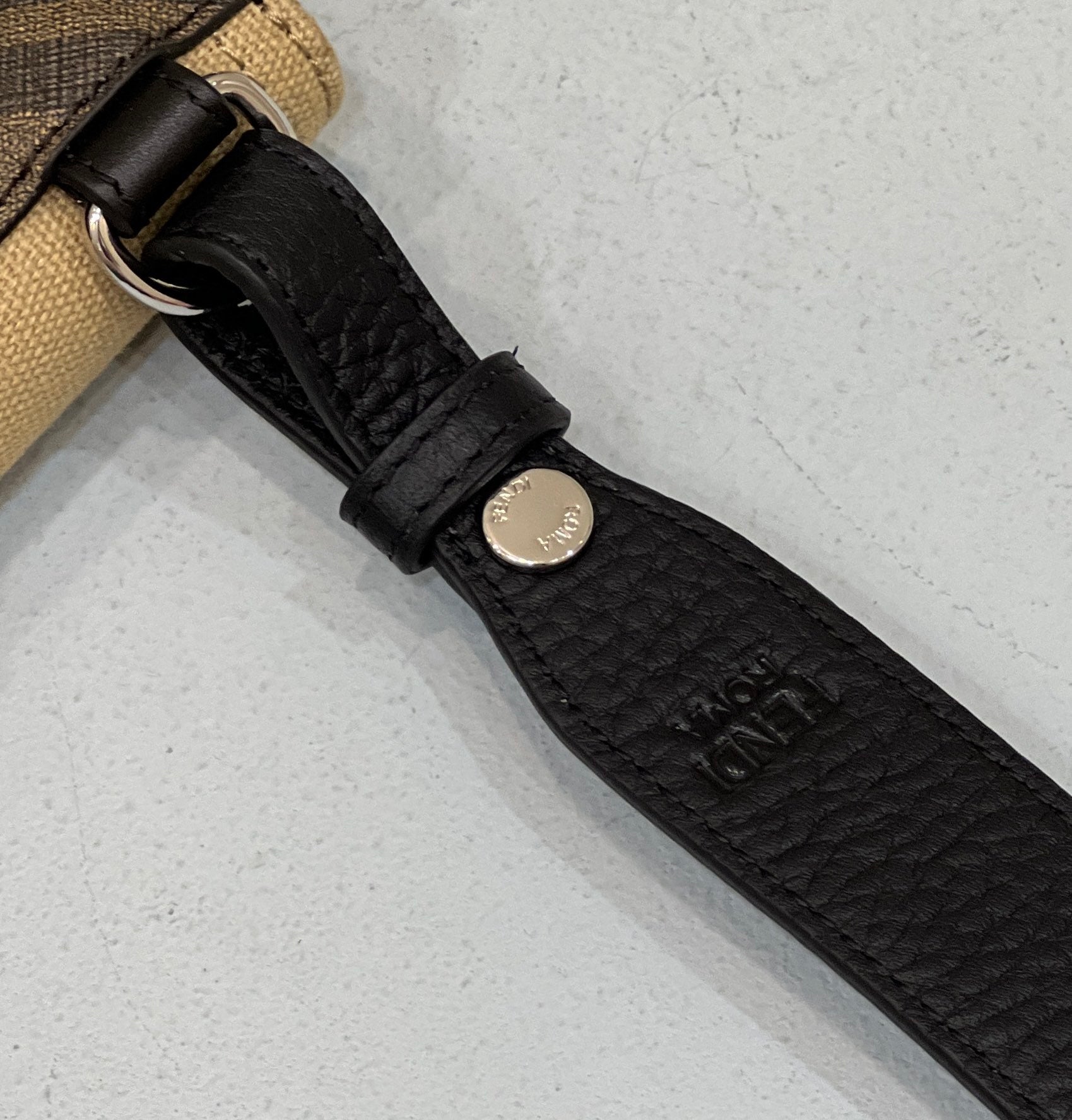 Baguette pouch with square flap and FF magnetic clasp. Can be worn at the waist, over the shoulder or cross-body by attaching the removable strap. Lining with zipper pocket. Made of fabric with FF motif. Embellished with natural canvas flap and black leather details. Palladium-finish metalware.