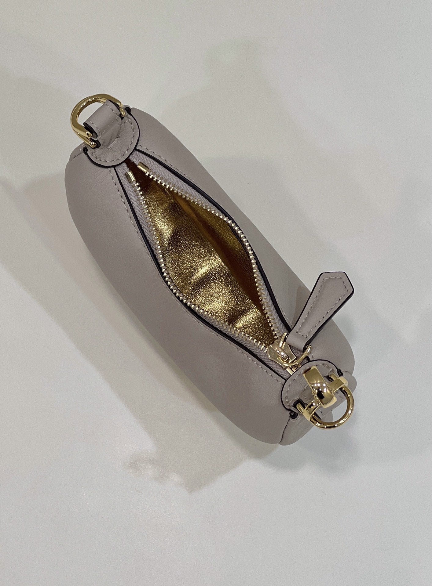 Zipper closure with fabric-lined internal compartment, gold-finish metalware.