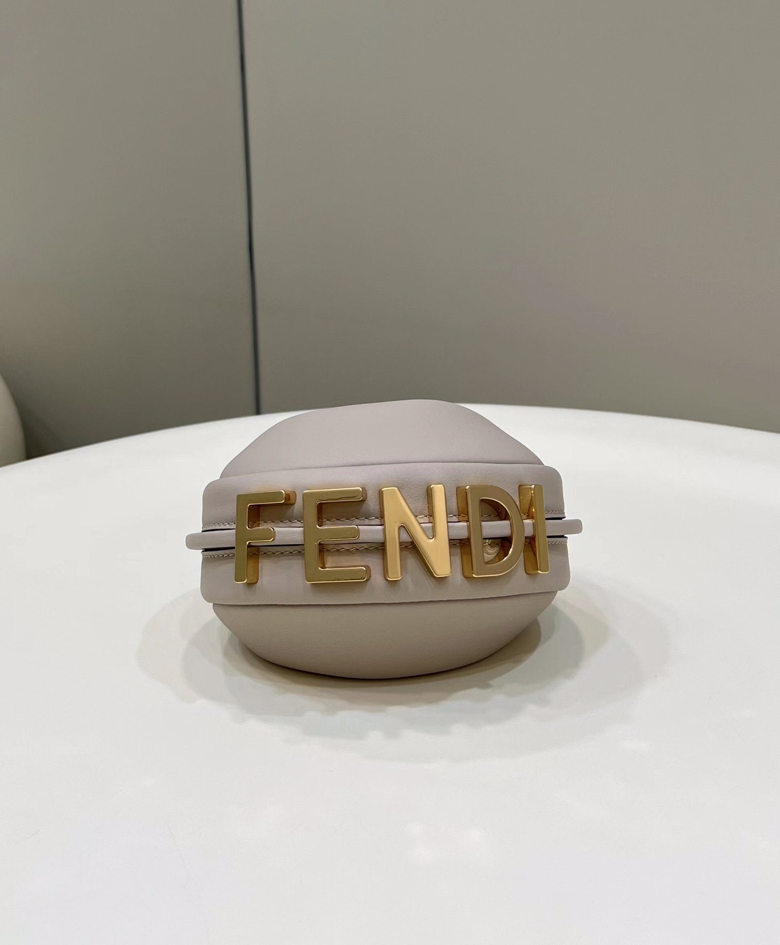 Mini hobo bag made of soft beige leather, decorated with vintage gold metal FND lettering visible when wearing the bag under the arm.