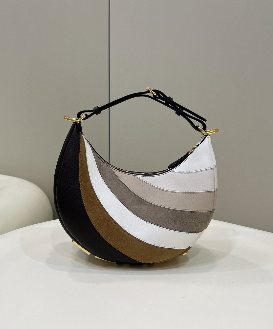 Small Hobo bag produced by inlaying leather, laminated leather and suede by hand to a rainbow diagonal striped motif in shades of beige and brown. With vintage gold metal FND lettering visible when the bag is worn under the arm.