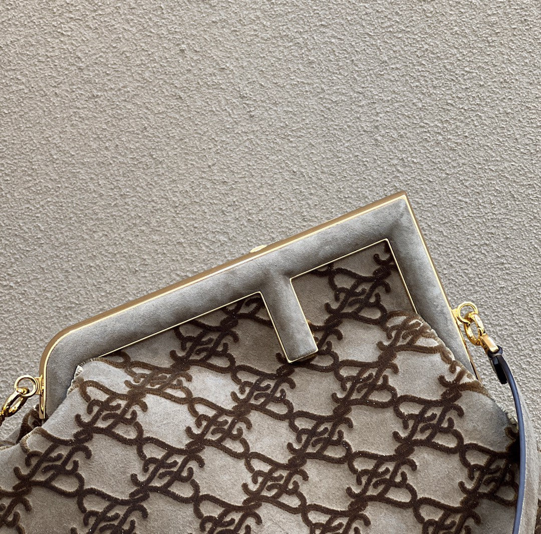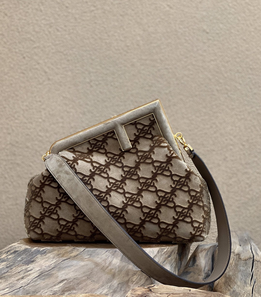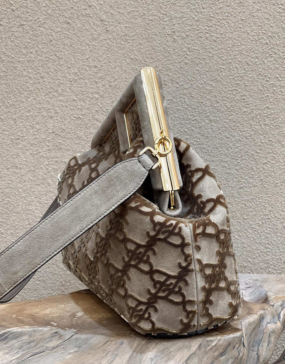 Medium FND First bag made of soft, Gray nappa leather with oversized metal F clasp bound in tone on tone suede.