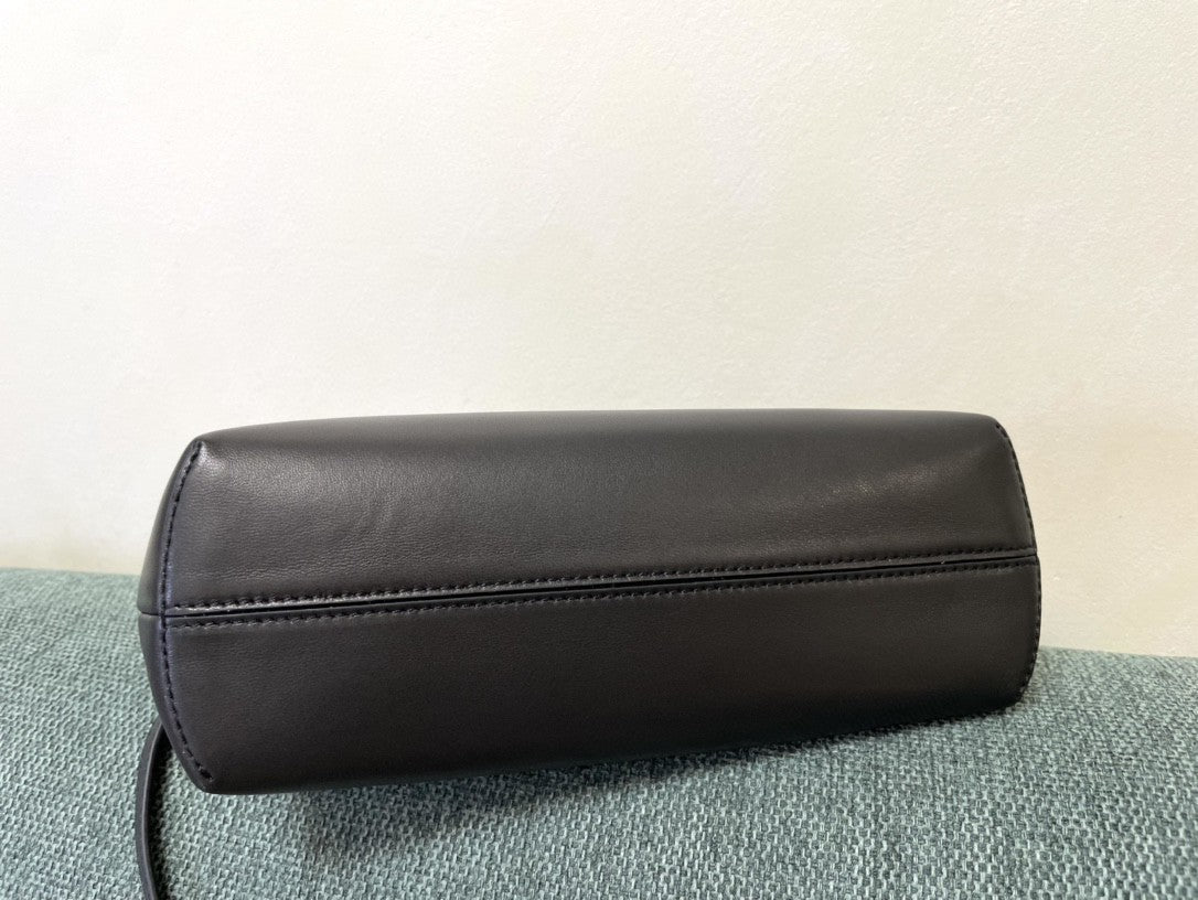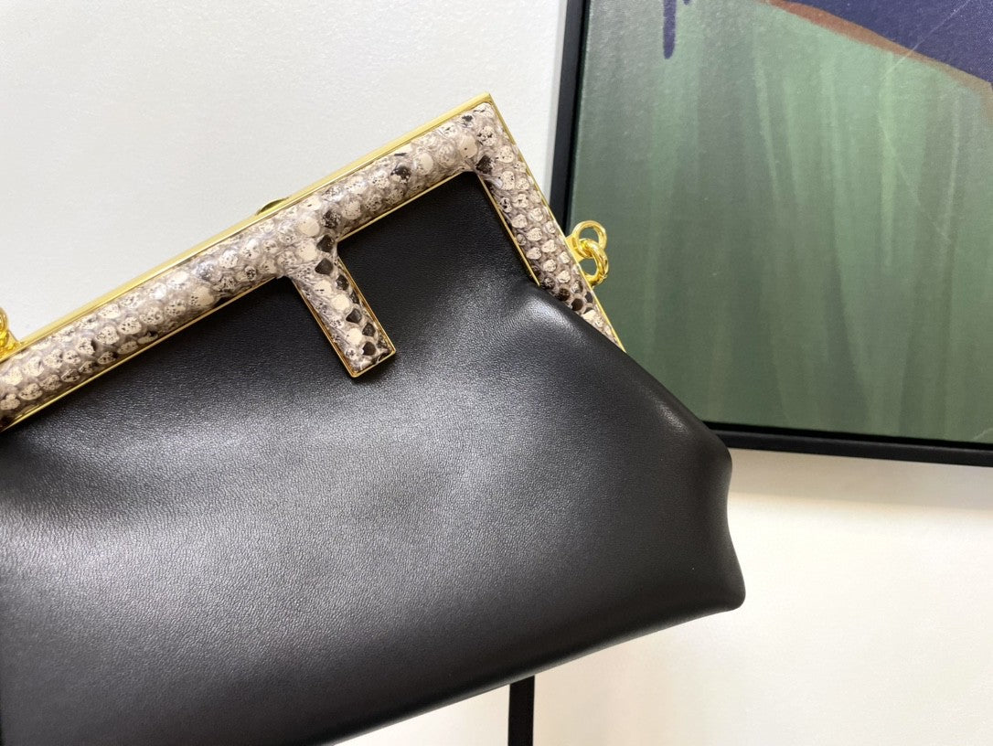 Small FND First bag made of soft black nappa leather with oversized metal F clasp bound in exquisite rock-colour python leather.