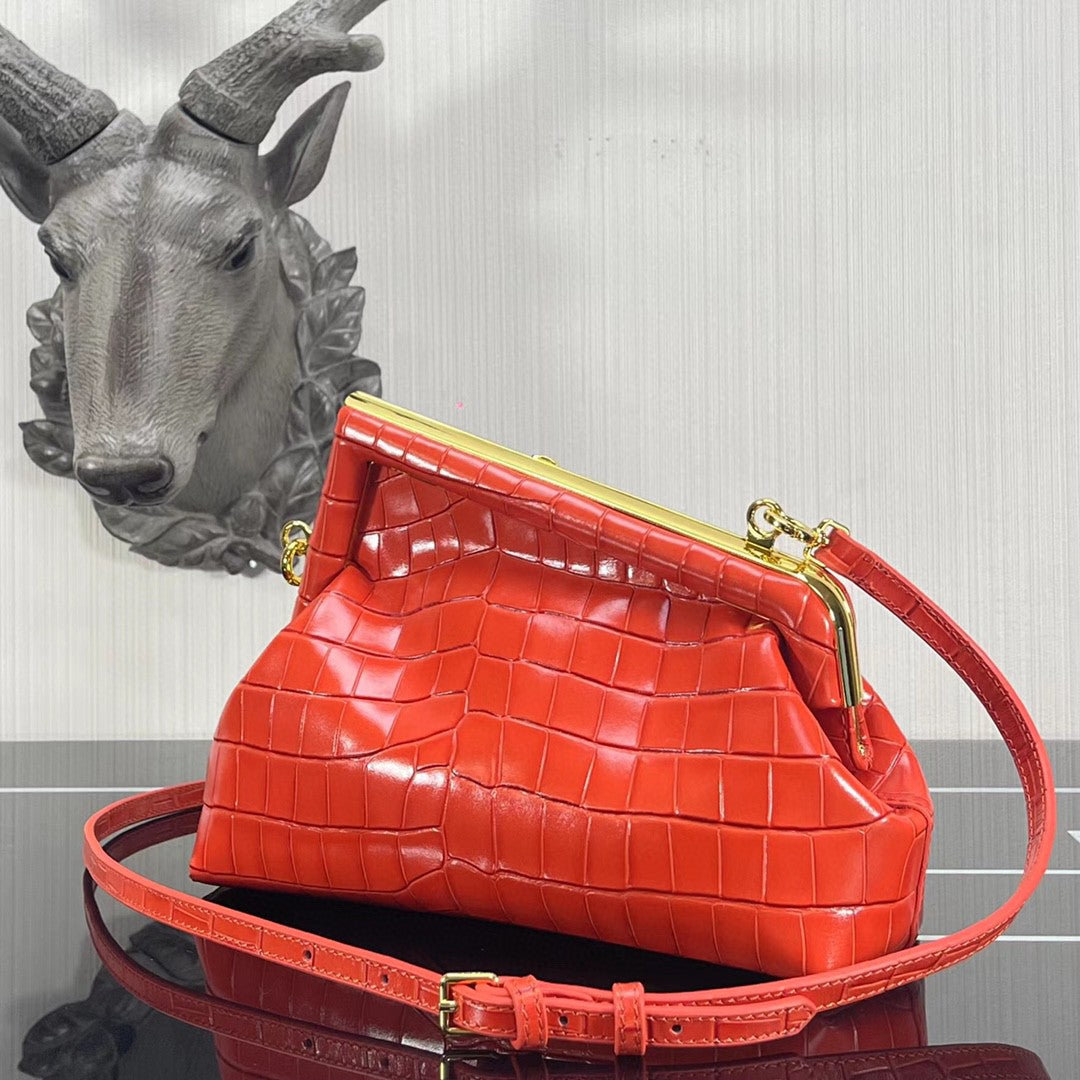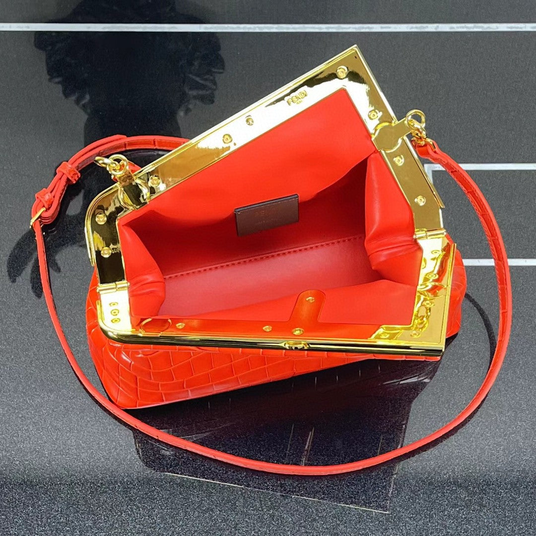 Small FND First bag in exquisite orange crocodile leather with an oversized F metal clasp with tone on tone crocodile leather bands.