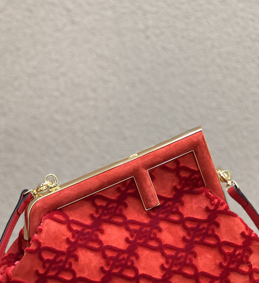 Small FND First bag made of soft, red nappa leather with oversized metal F clasp bound in tone on tone suede.