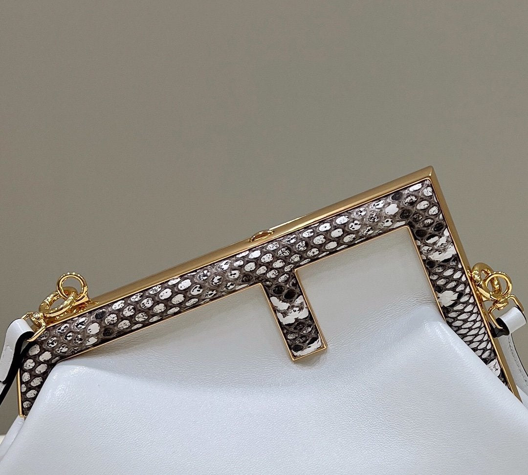 Small FND First bag made of soft, white nappa with oversized metal F clasp wrapped in tone on tone python. Can be carried by hand as a clutch or worn on the shoulder thanks to the detachable shoulder strap.
